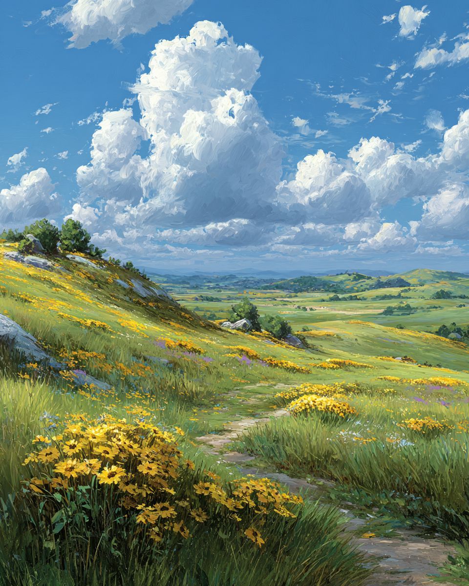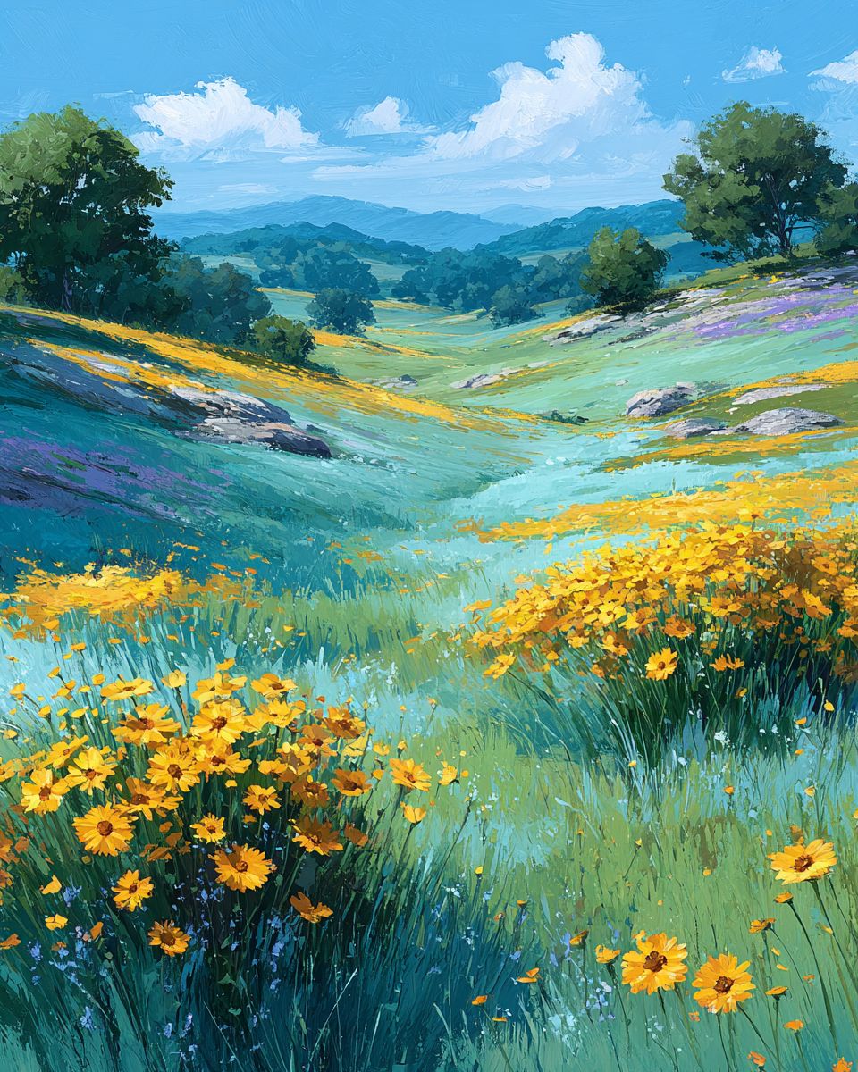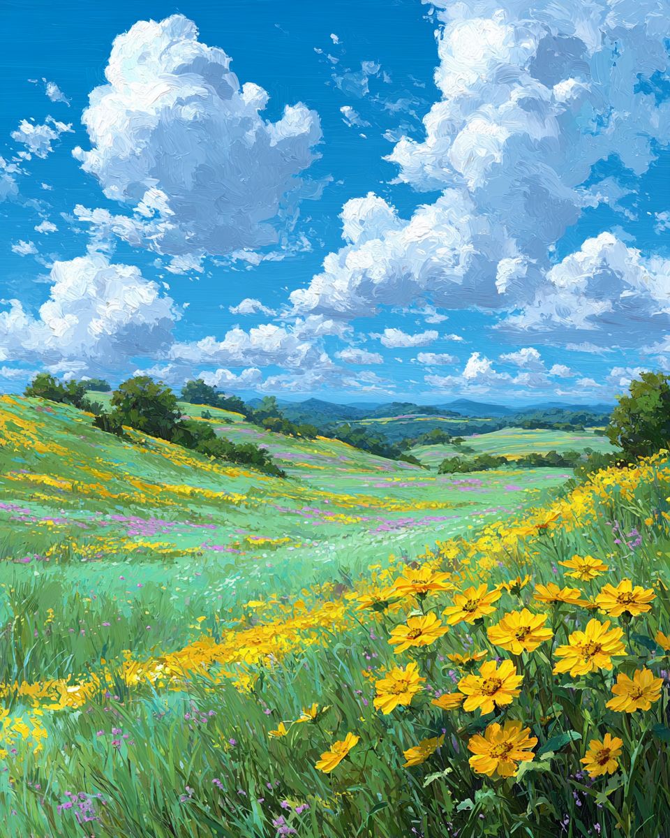 Яркая и нежная иллюстрация залитых солнцем холмистых лугов, усеянных золотыми подсолнухами и мягкой зеленой травой, под ясным лазурным небом. Сцена передает тепло и надежду лета, используя пастельные желтые, светло-зеленые и небесные синие тона. Стиль живописи должен быть современным импрессионизмом, с мягкими мазками кисти и мечтательной, успокаивающей атмосферой. Изображение должно вызывать чувства мира, радости и бесконечного лета.