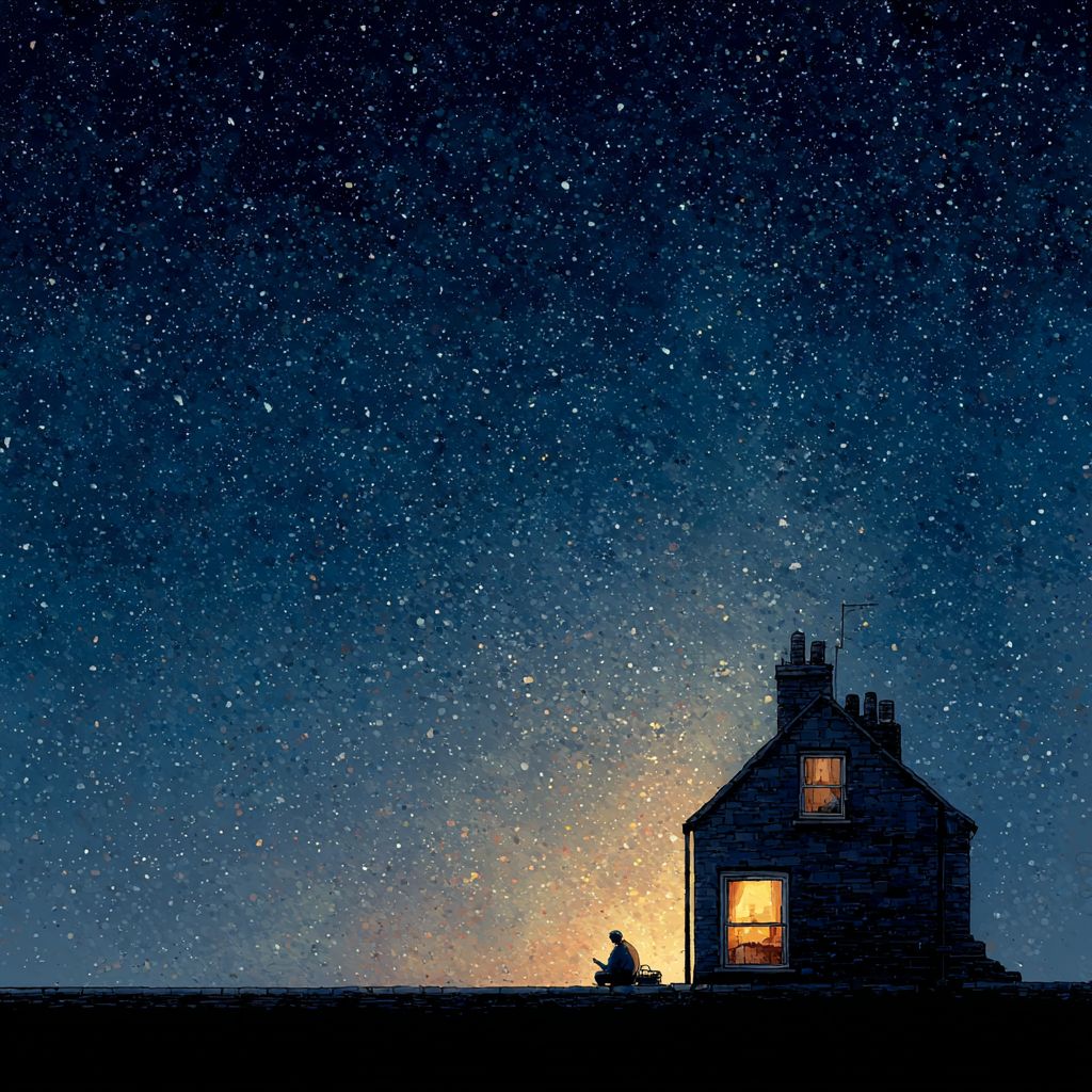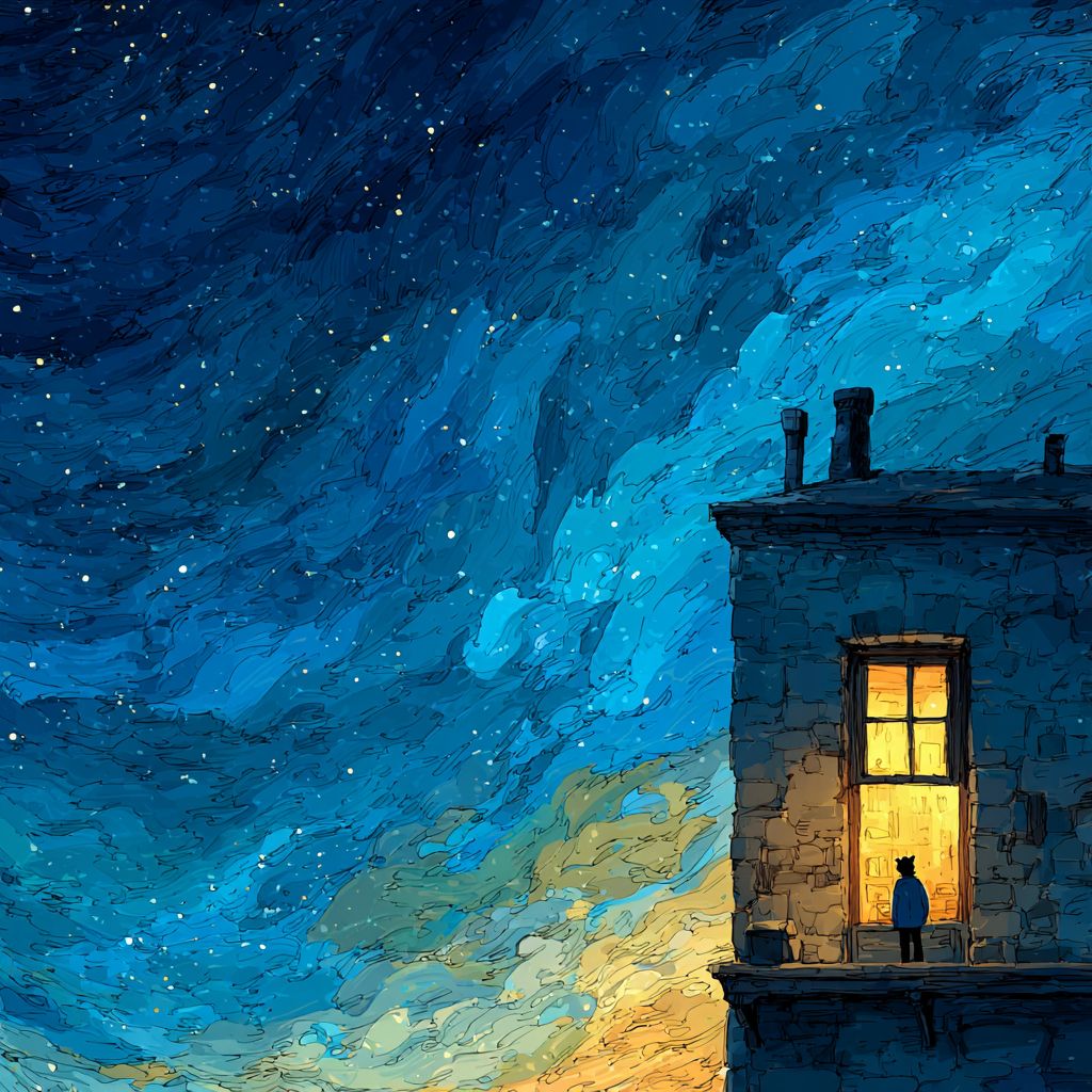 Окно в доме светится, в нём видна фигура человека, над домом бесконечное звёздное небо, в стиле детского рисунка.