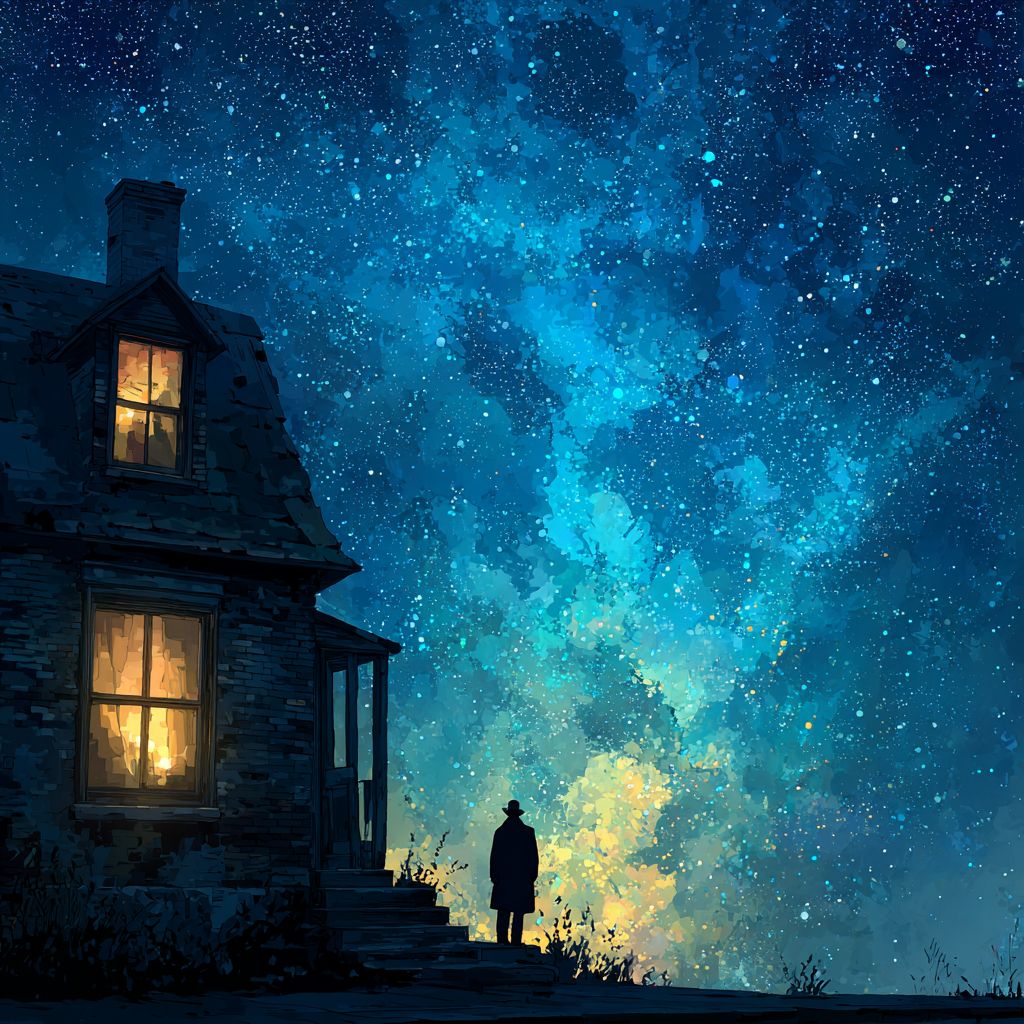 Окно в доме светится, в нём виден силуэт человека, над домом - бескрайнее звёздное небо