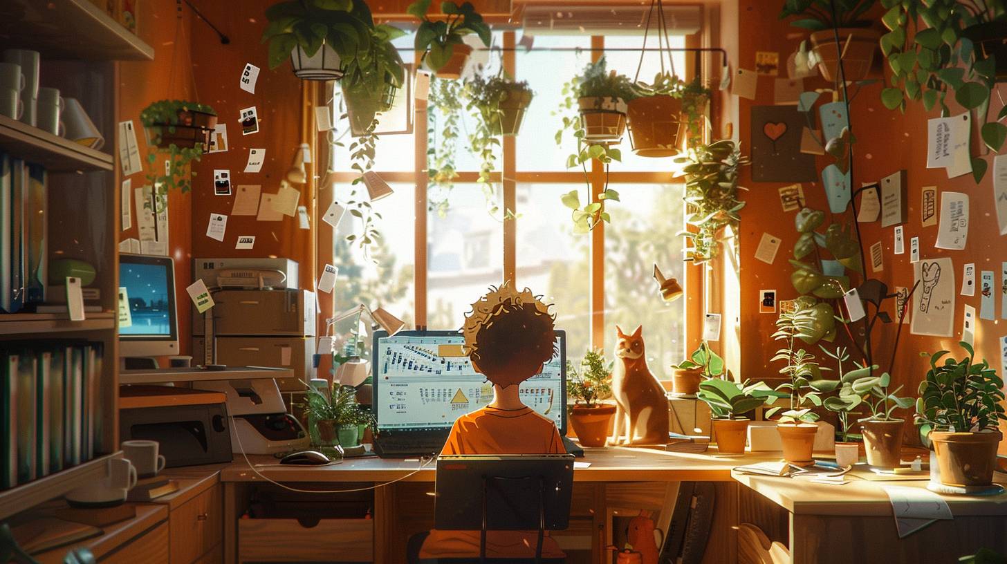 В домашнем офисе ребенок с кошкой и собакой сидит перед ноутбуком, на экране которого видно строительное чертеж, вокруг много горшечных растений и заметок, прикрепленных к стенам и соединенных нитями.