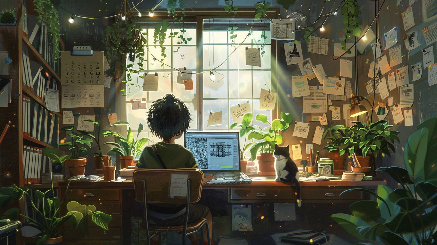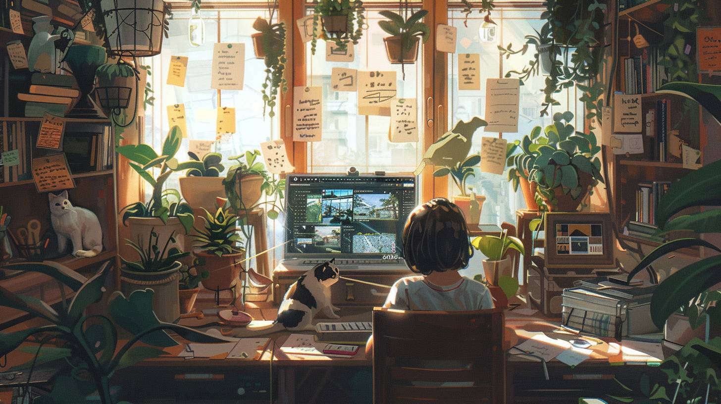 В домашнем офисе ребенок с кошкой и собакой сидит перед экраном ноутбука. На ноутбуке можно увидеть строительный чертеж. По всей комнате расставлены горшечные растения. На стенах приклеено много записок, соединенных нитками. Кинематографическая иллюстрация, Otake Chikuha, Irina Nordsol Kuzmina