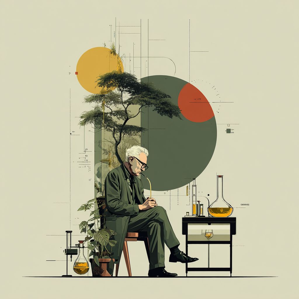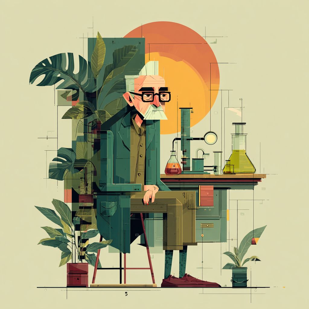 a minimal flat illustration for the brand 'Sunsophia' . A scientist in a lab. natural colors, green beige brown. --s 750