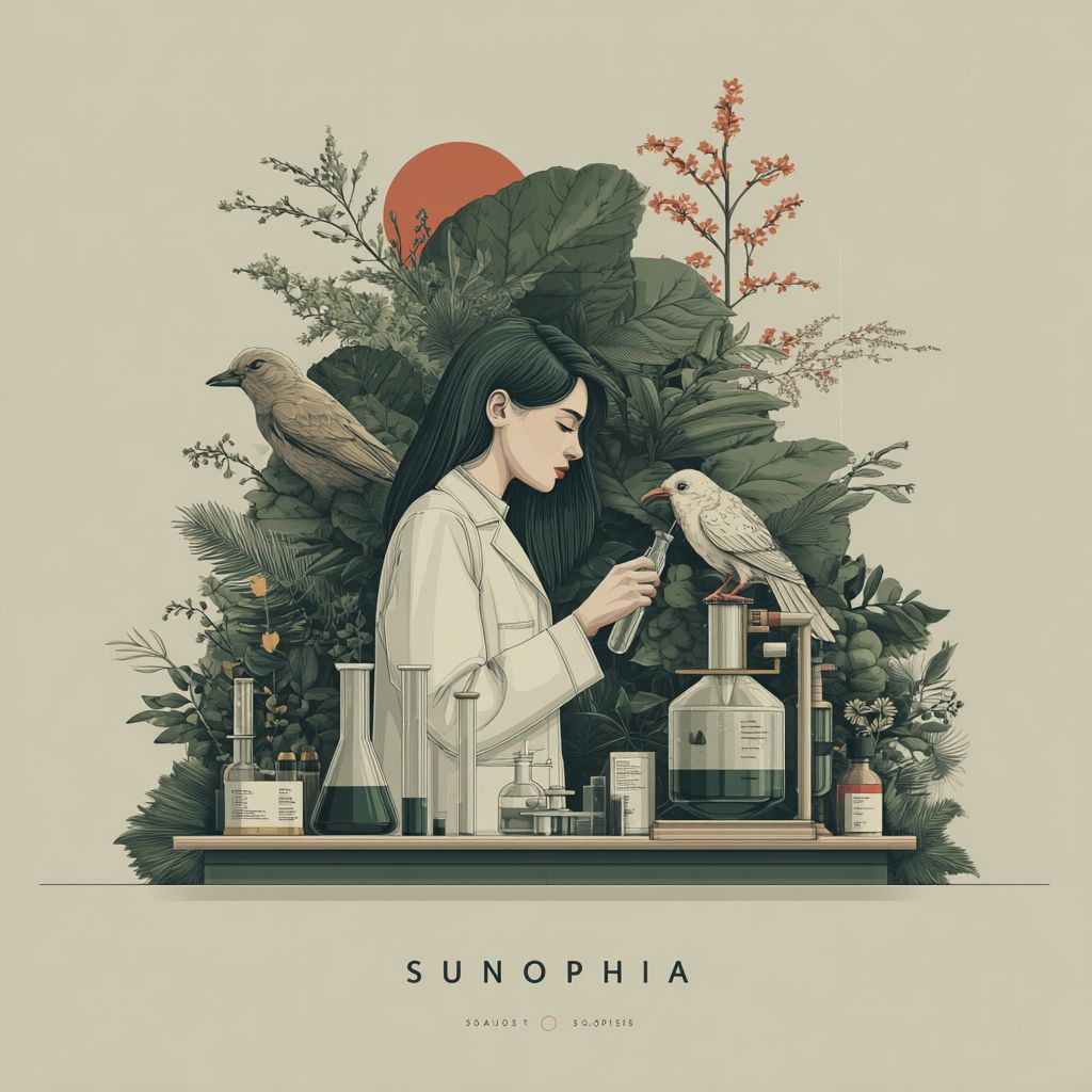 Минималистская плоская иллюстрация для бренда 'Sunsophia', изображающая ученого в лаборатории, выполненная в природных цветах: зеленом, бежевом и коричневом