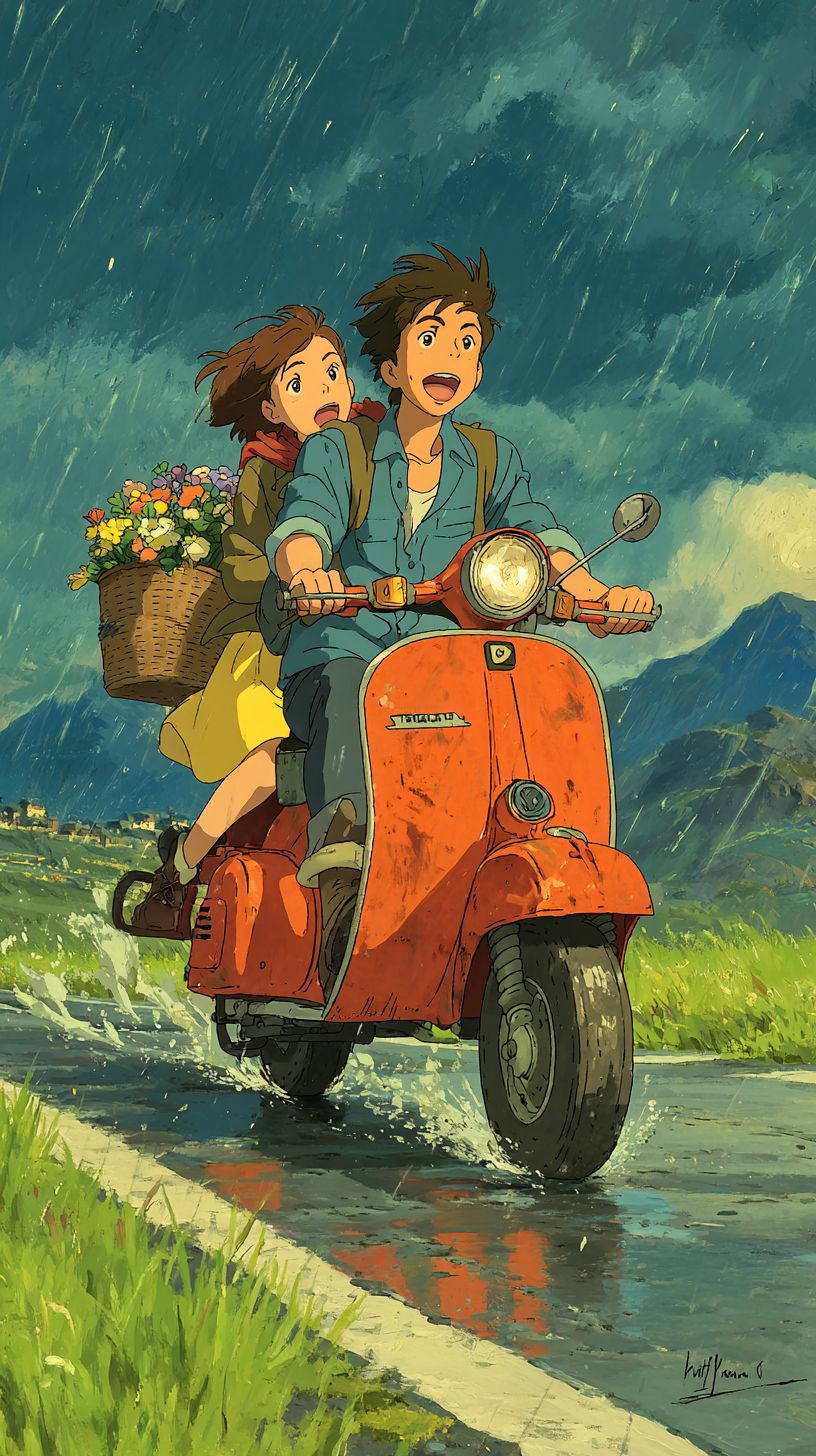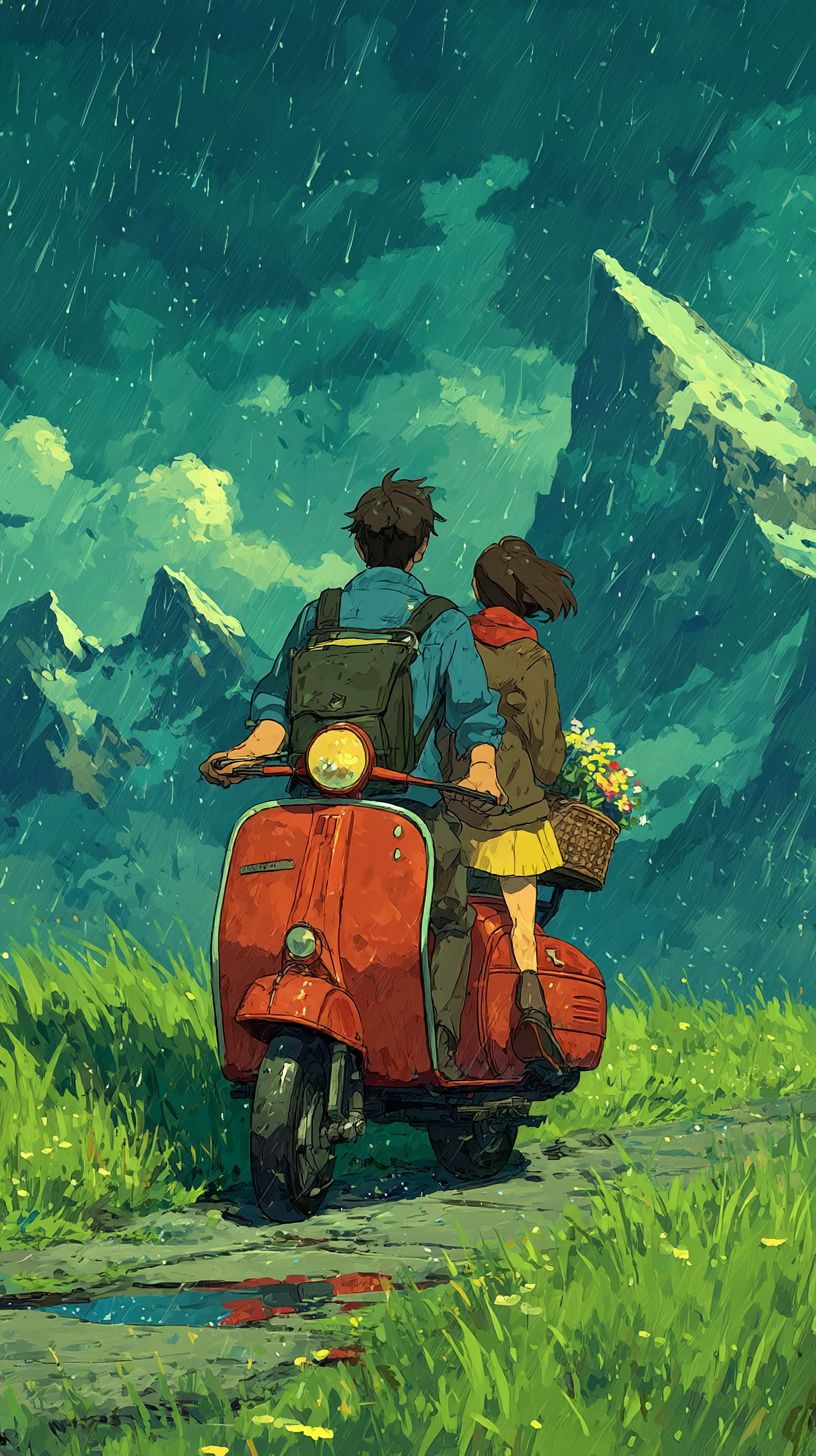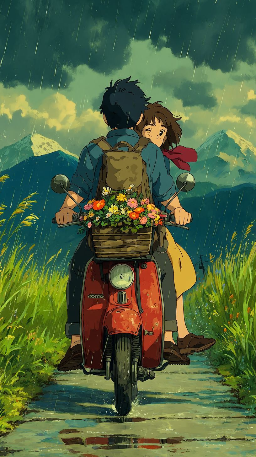 anime style ,two people riding a red vintage scooter on a rainy night, wet reflective road with puddles and splashes, dark cloudy sky with light rain, flowering grasses softly covering both sides of the road, landscape of magnificent mountains and hills, a basket of colorful flowers on the back of the scooter on a spring evening, the driver wearing a blue shirt and dark pants, a woman wearing a brown jacket, yellow skirt and a red scarf waving in the wind, a happy woman hugging the man, peaceful atmosphere, Studio Ghibli style, anime style , soft textures, anime landscape, peaceful and emotional mood --ar 9:16 --quality 2 --s 750
