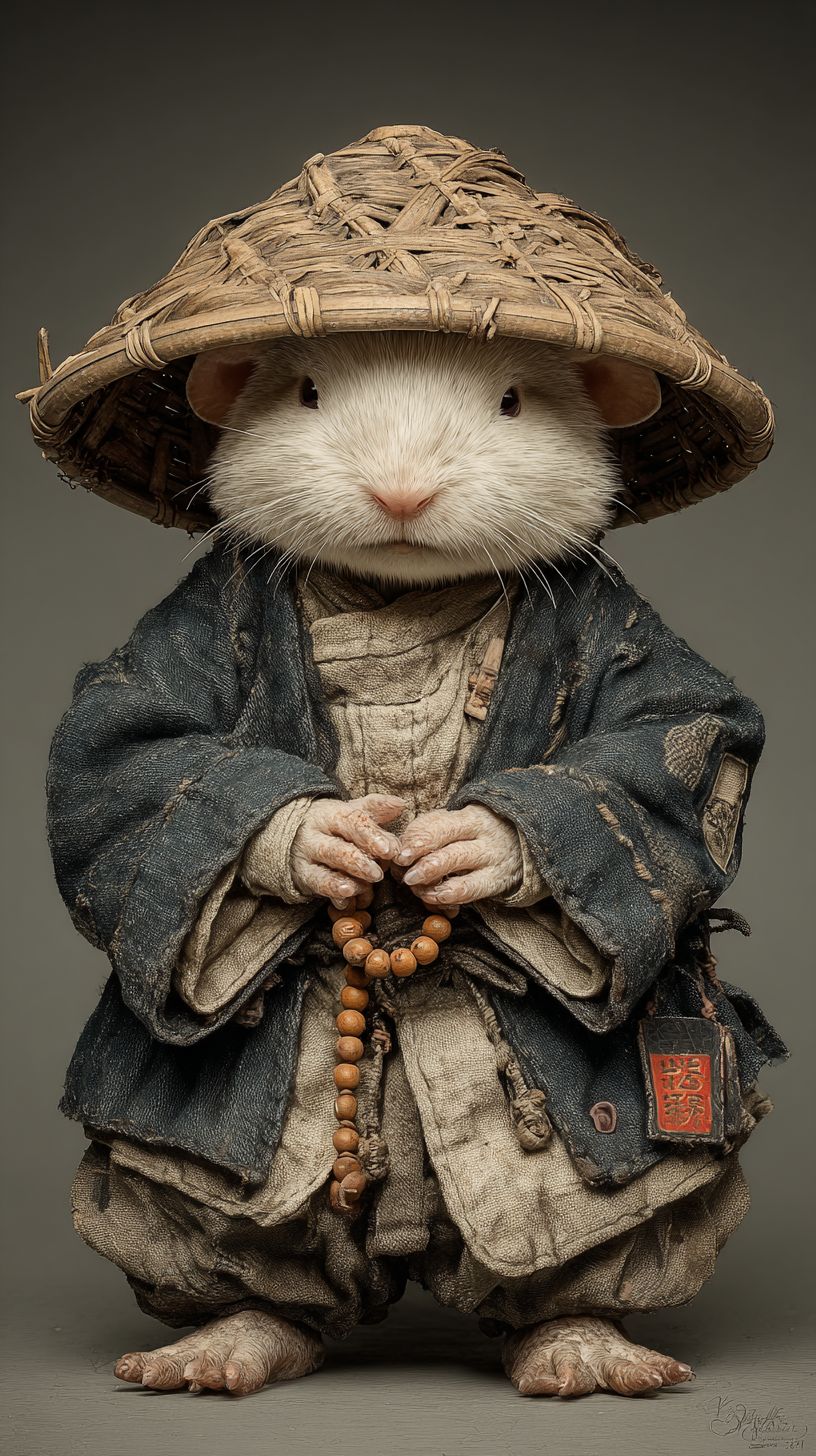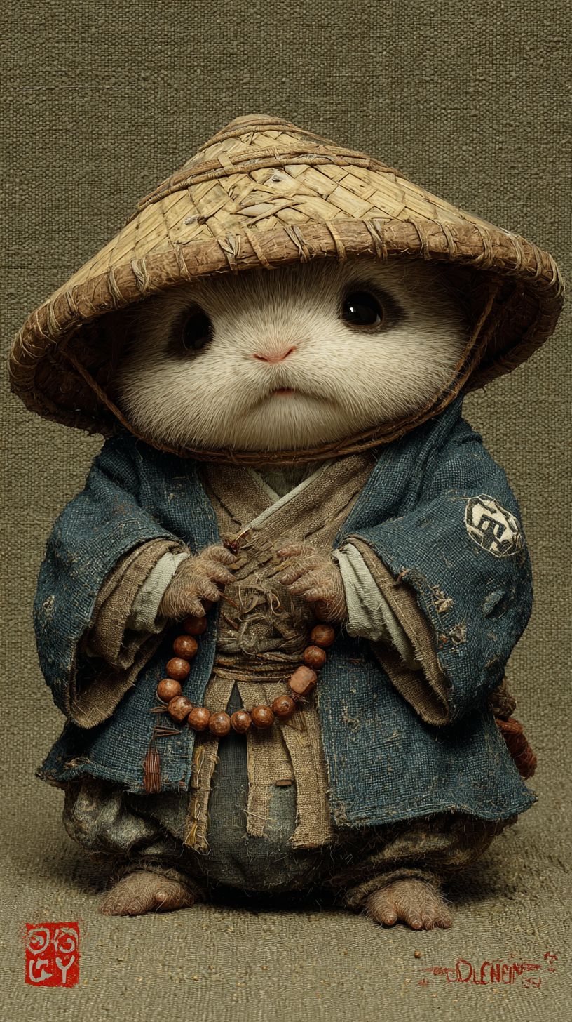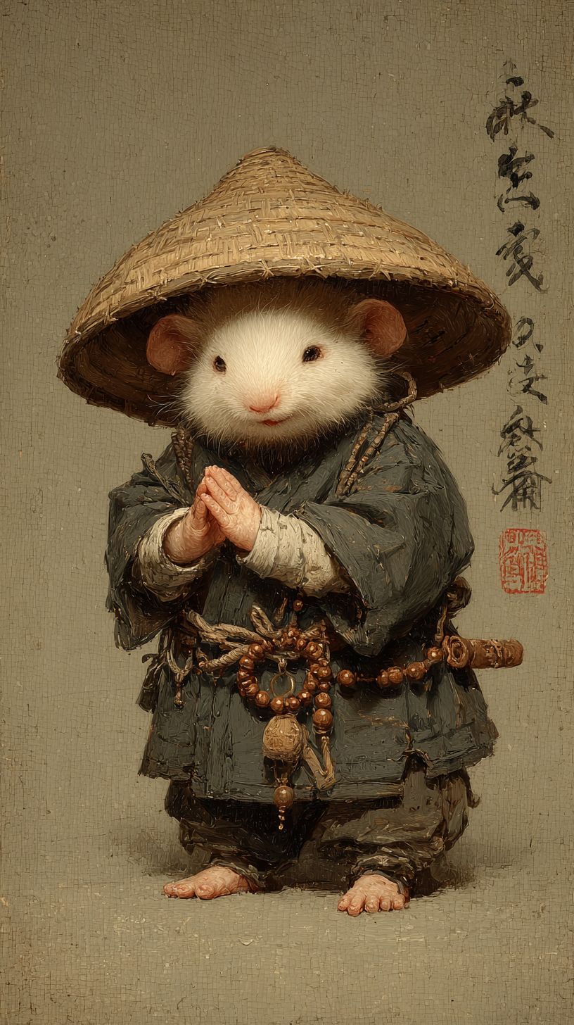 Тонкая работа кистью, маленькая крот, вид спереди, в бамбуковой шляпе, крупный план всего тела, сидя с сложенными ногами, в монашеской одежде, с ниткой буддийских бус, с сложенными руками, милый, древний китайский стиль