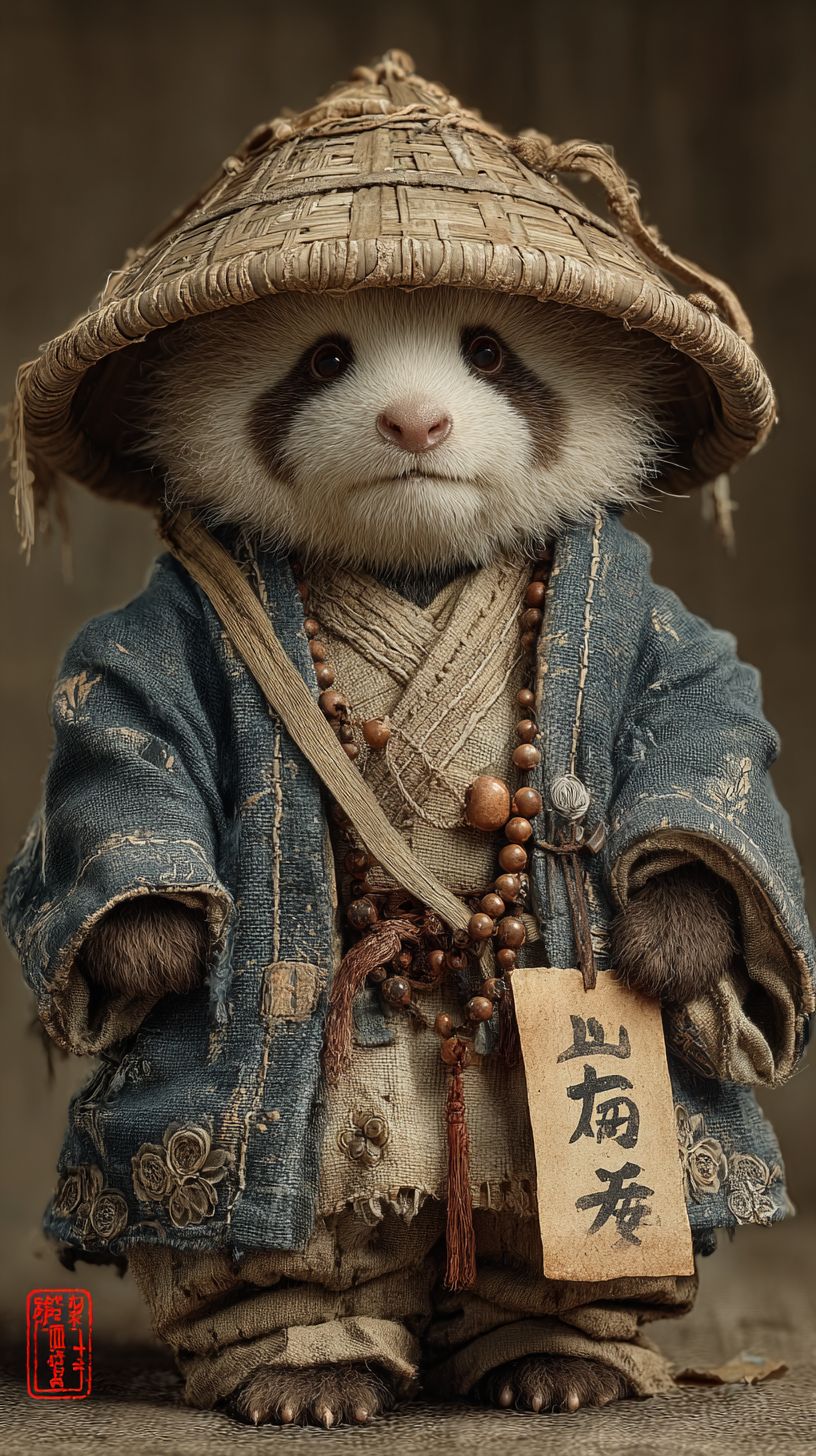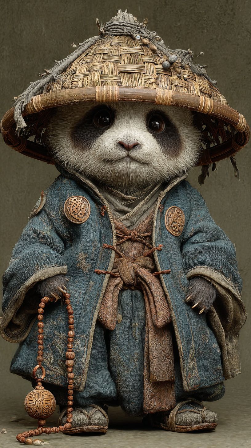 Fine brushwork, little panda, front view, wearing a bamboo hat, full body close-up, sitting cross-legged, wearing monk's clothes, wearing a string of Buddhist beads, with hands folded, cute, ancient Chinese style, --ar 9:16 --s 750