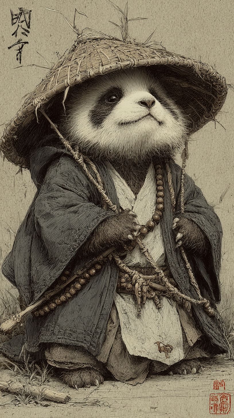 Тонкая работа кистью, маленькая панда, вид спереди, в бамбуковой шляпе, крупный план всего тела, сидя по-индийски, в одежде монаха, с буддийскими четками, с сложенными руками, милый, древний китайский стиль