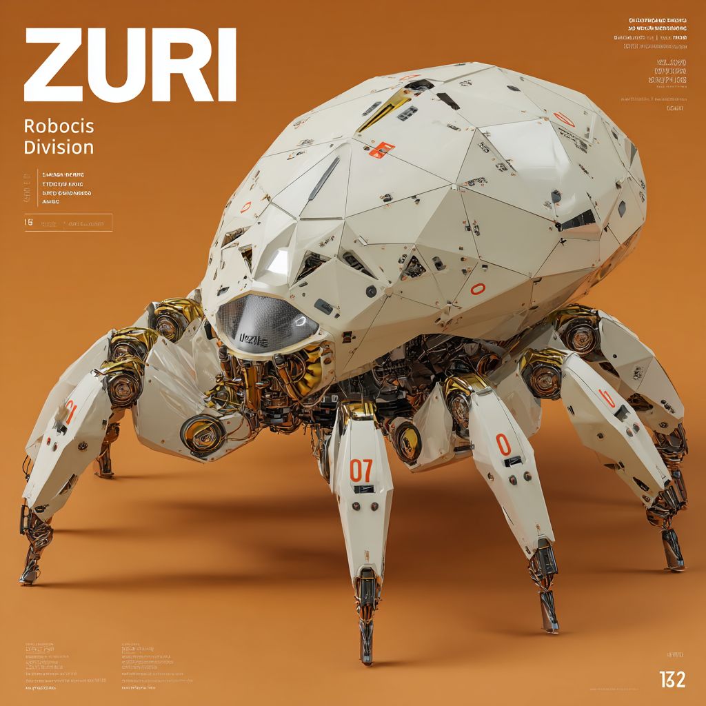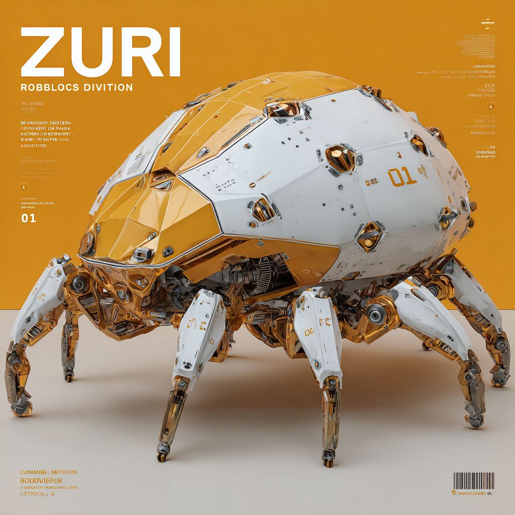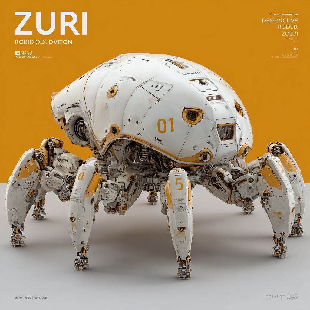 Чистый 3D рендер футуристического robotic объекта с маркировкой 'ZURI Robotics Division', разработанного с острыми белыми полигональными панелями, расположенными в симметричной геометрической форме. Робот имеет куполообразное центральное тело и четыре суставные полигональные ноги, каждая панель помечена номерами, такими как '01', '03' и '04'. Используйте однотонный плоский оранжевый фон, без теней, с минимальным освещением и без отражений окружения. Стиль рендеринга должен быть минималистичным, с высоким контрастом и научно-фантастическим промышленным обликом, идеальным для демонстрации продуктов или презентаций концептуального дизайна.
