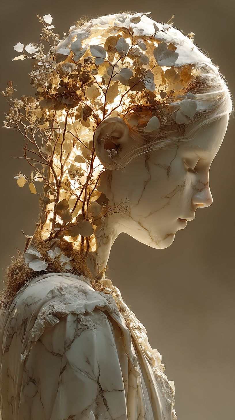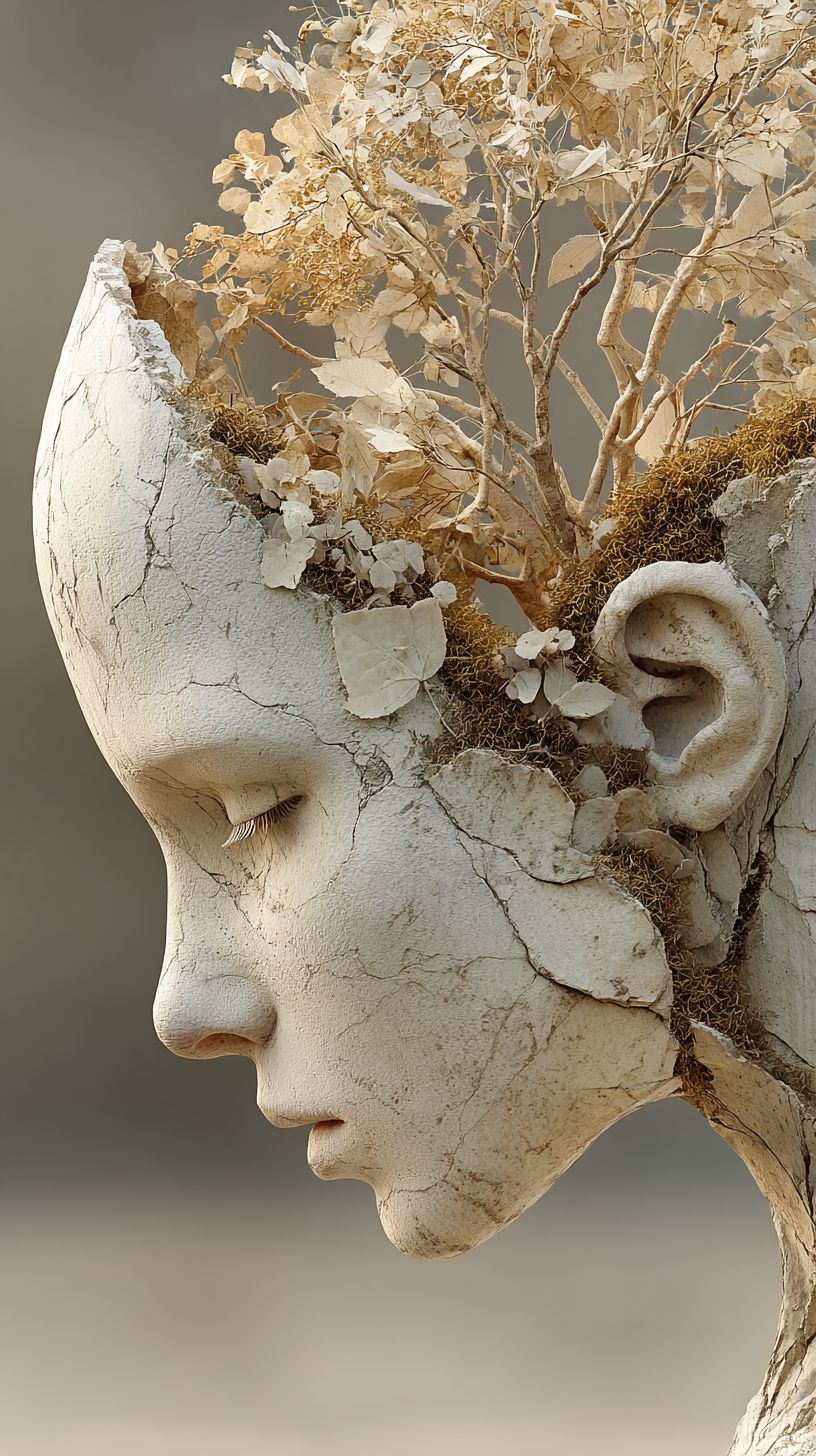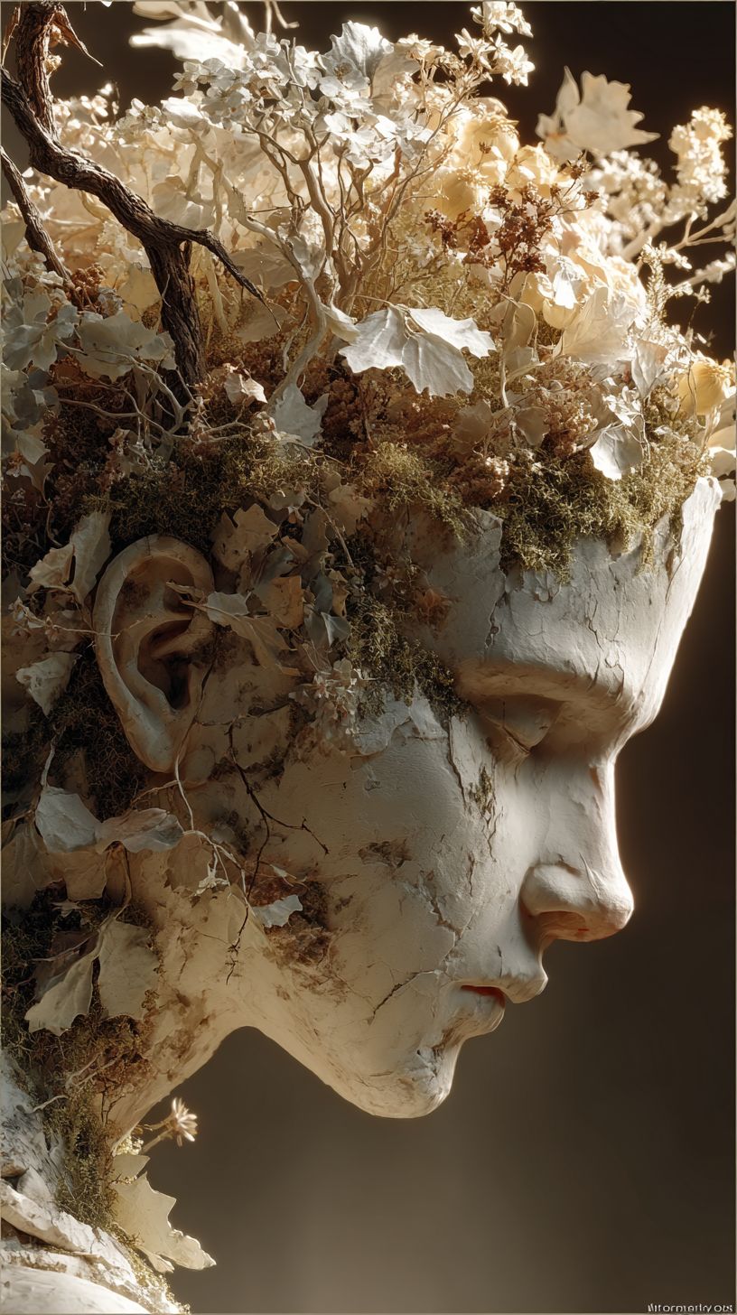 Surrealism: A soft marble profile of a woman, her head gently opened at the crown like a shallow vessel. Within it grows a miniature, withered garden delicate pale branches, faded leaves, and dry moss, arranged like a quiet memory rather than a living scene. The entire composition is lit with warm, filtered light in sepia and bone-white tones, as though preserved in time. Her face remains still, contemplative, as if tending to what once was. The atmosphere is minimal, textured, and introspective no vivid color, only warmth and restraint. --ar 9:16 --s 750
