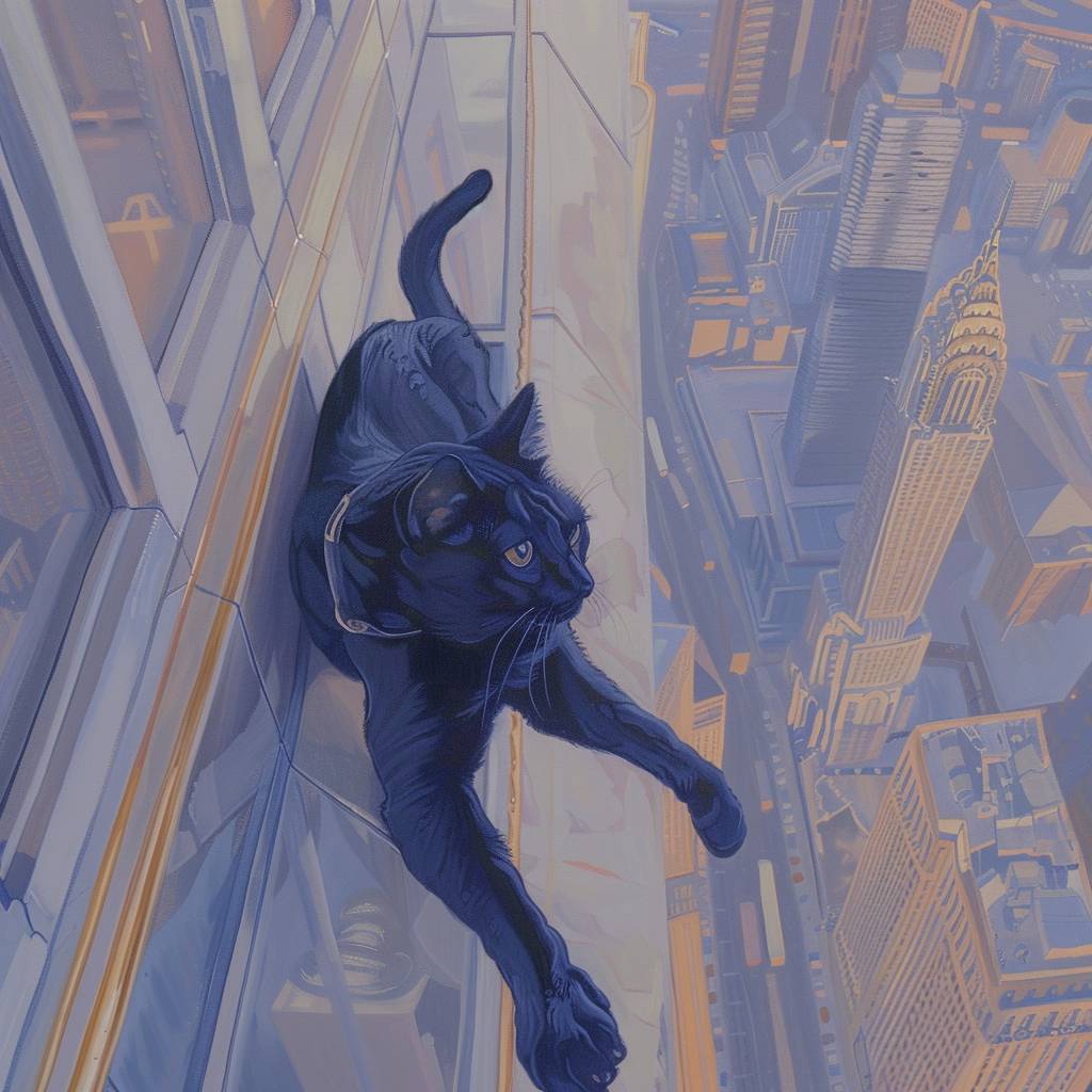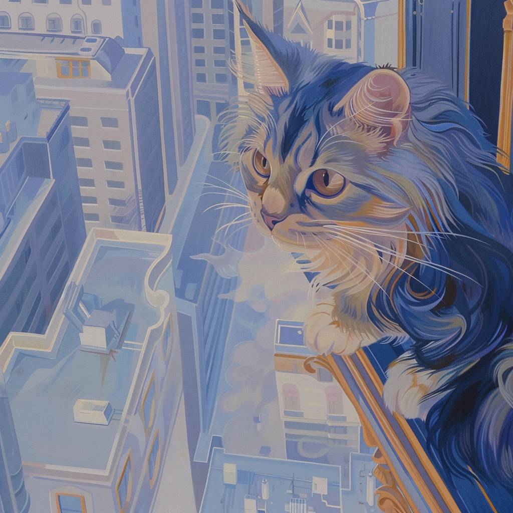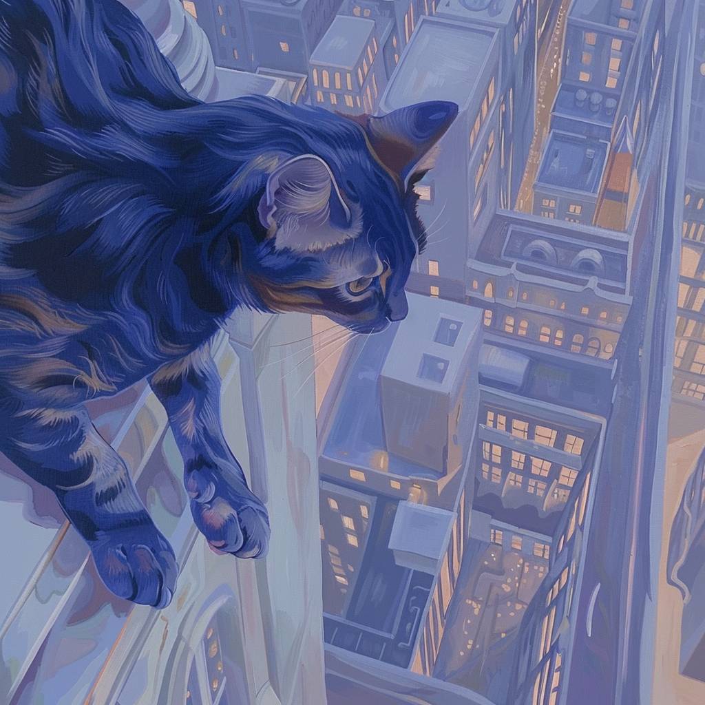 Кот на высоком здании наблюдает за городом, испытывая головокружение.
