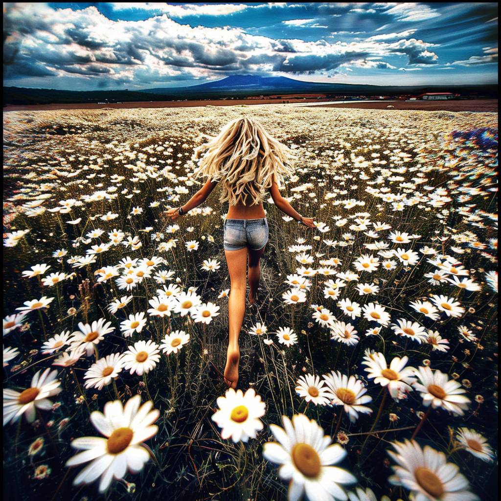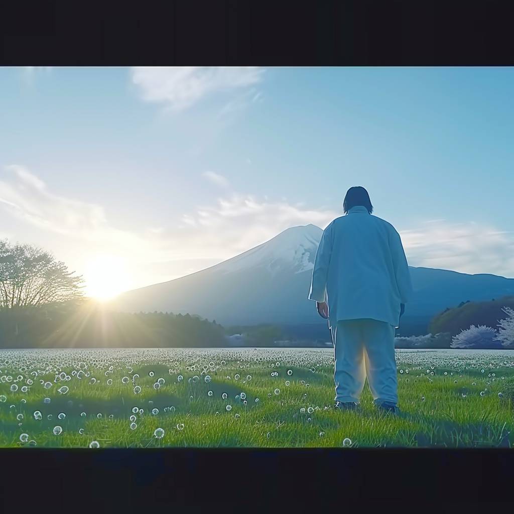Auralee Minimalist fashion week, walking down the runway in a valley of daisies, mount fuji in the background,in the style of shoegaze, 2001 Sony HDW F900 film, Shunji Iwai, Rinko Kawauchi --seed 1001 --chaos 100 --v 6.0