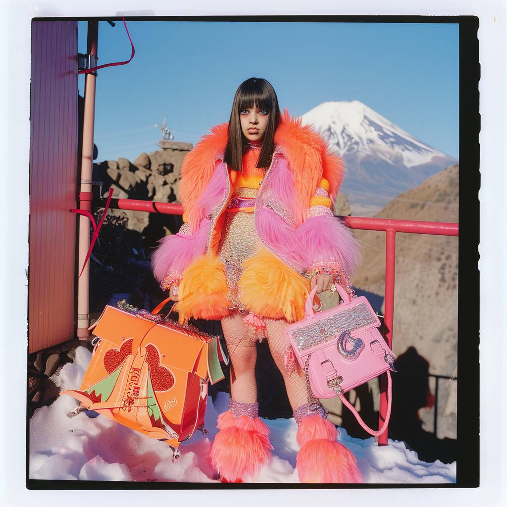 Auralee на подиуме в долине ромашек на фоне горы Фудзи, демонстрируя минималистичную моду в стиле шугейз.