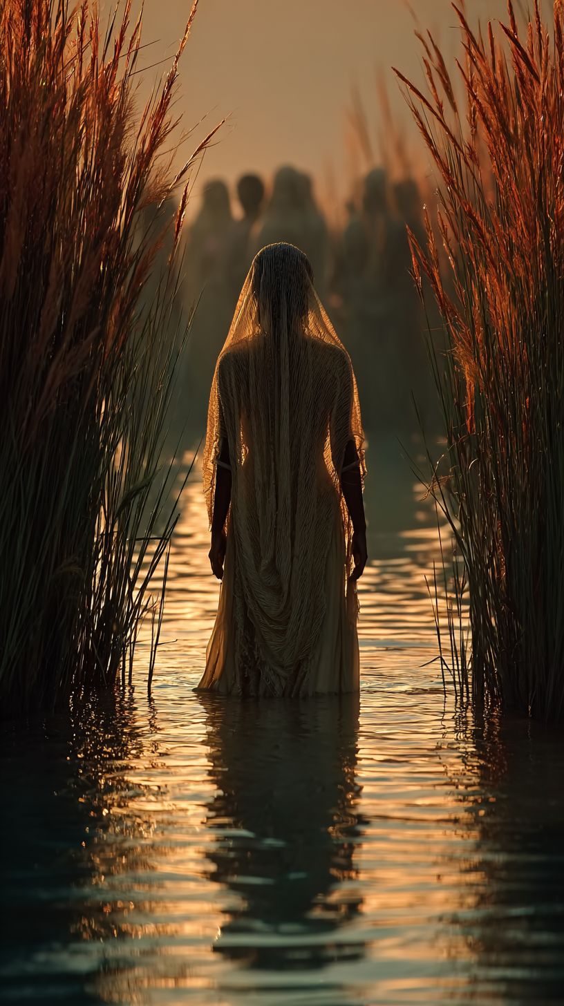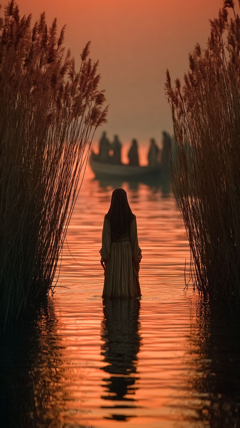 Cinematic image, shot on telephoto, Ultrarealistic image, biblical setting, biblical atmosphere, Miriam standing quietly among tall reeds of the Nile riverbank, watching the basket floating downstream, distant silhouettes of Egyptian women at the water’s edge, soft morning light and gentle ripples in water, atmosphere of protective sibling love and divine orchestration --ar 9:16 --s 750