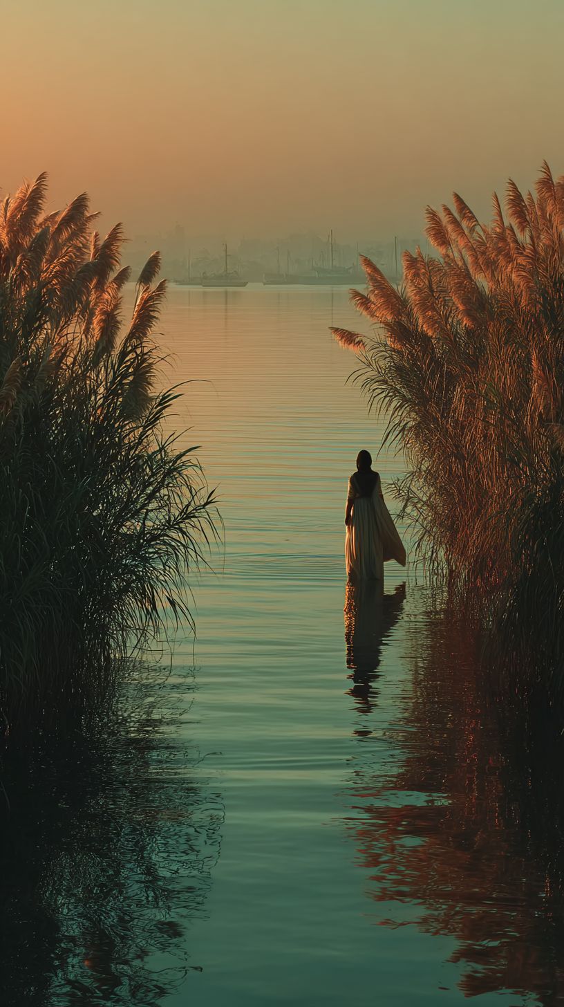 Кинематографическое изображение, снятое с телеобъективом, ультрареалистичное изображение, библейская обстановка, библейская атмосфера, Мариам тихо стоит среди высоких тростников на берегу Нила, наблюдая за корзиной, плывущей по течению, далекие силуэты египтянок на берегу воды, мягкий утренний свет и легкие ряби на воде, атмосфера защитной братской любви и божественной организации.