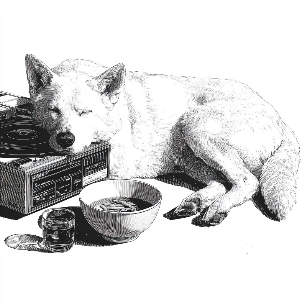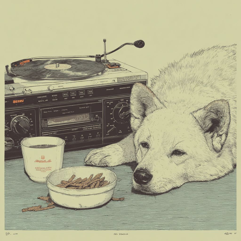Визуализация: Индийская собака Шеру лежит рядом с магнитофоном 90-х годов, голова resting рядом с маленькой чашкой лакомств Фафда. Фокус пищи: палочки Фафда для собак. Настроение: ленивое прослушивание, ритмичные хрустящие звуки. Стиль: минималистичный линейный рисунок.