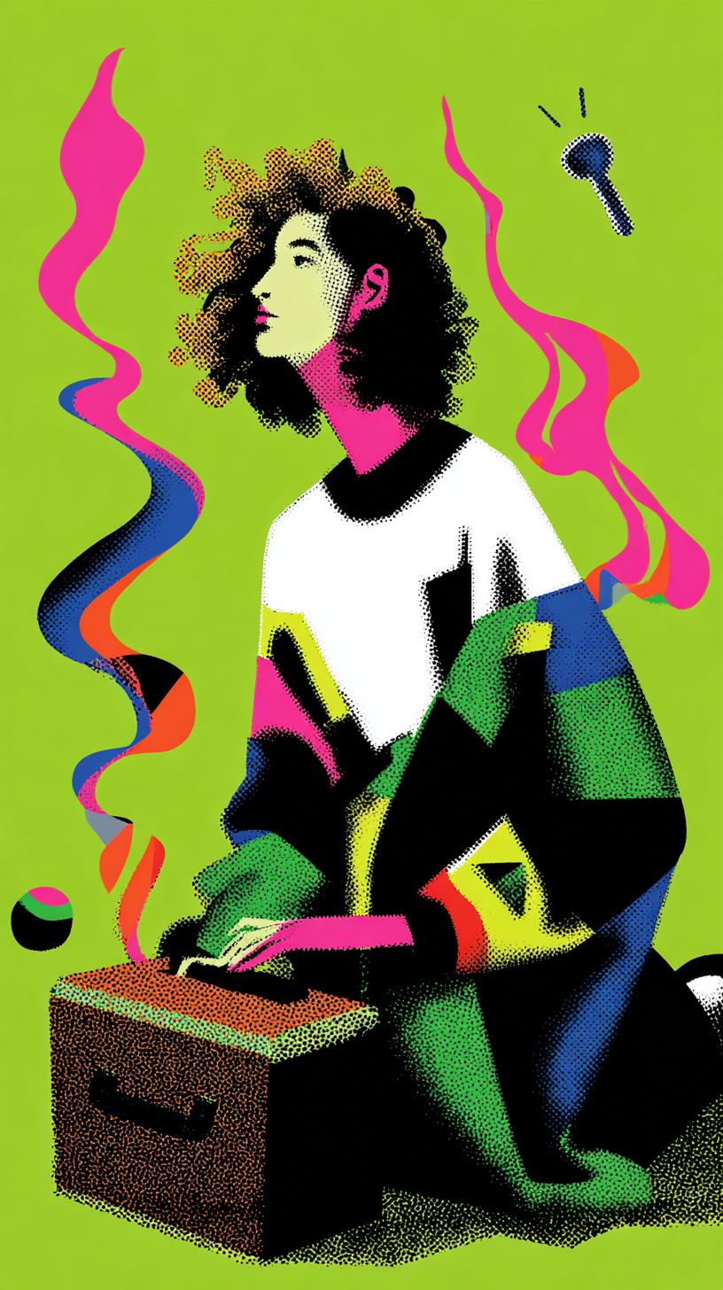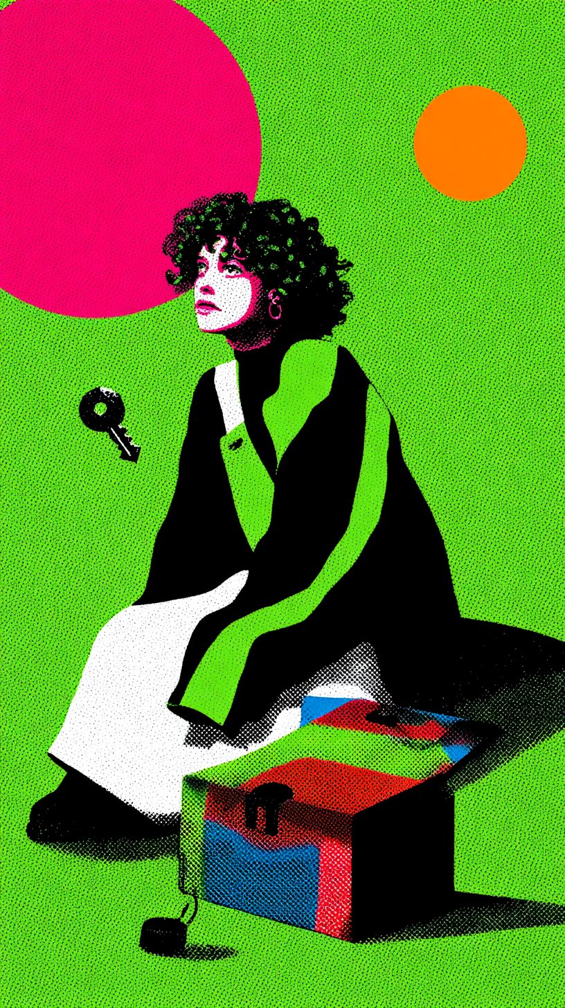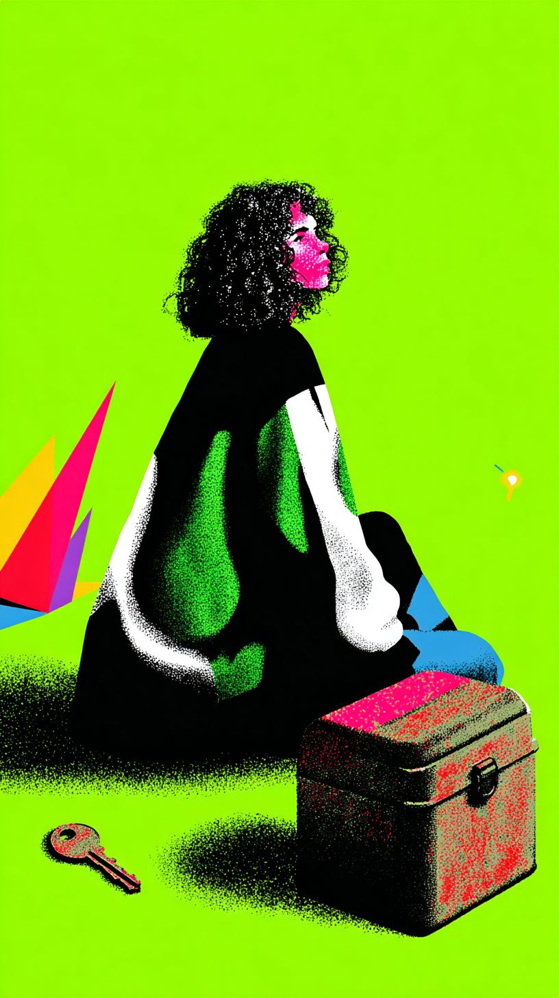 Молодая женщина с кудрявыми волосами, окрашенными в розовый, черный и белый цвета, сидит перед маленьким ржавым металлическим ящиком для инструментов, с тихим интересом глядя на него. Из его швов мягкий неоновый фиолетовый и зеленый свет вытекает, как сияющая творческая энергия, пытающаяся сбежать. Летающий ключ парит рядом с ее рукой, не касаясь ее. Ее черная и зеленая куртка слабо светится от отраженного света. Фон представляет собой плоский матовый неоново-зеленый цвет с обилием отрицательного пространства вокруг сцены. Изображено в плоском 2D стиле поп-арта с зернистыми ручными полутоновыми текстурами, высоким контрастом, сюрреалистической энергией и поэтической абстракцией.