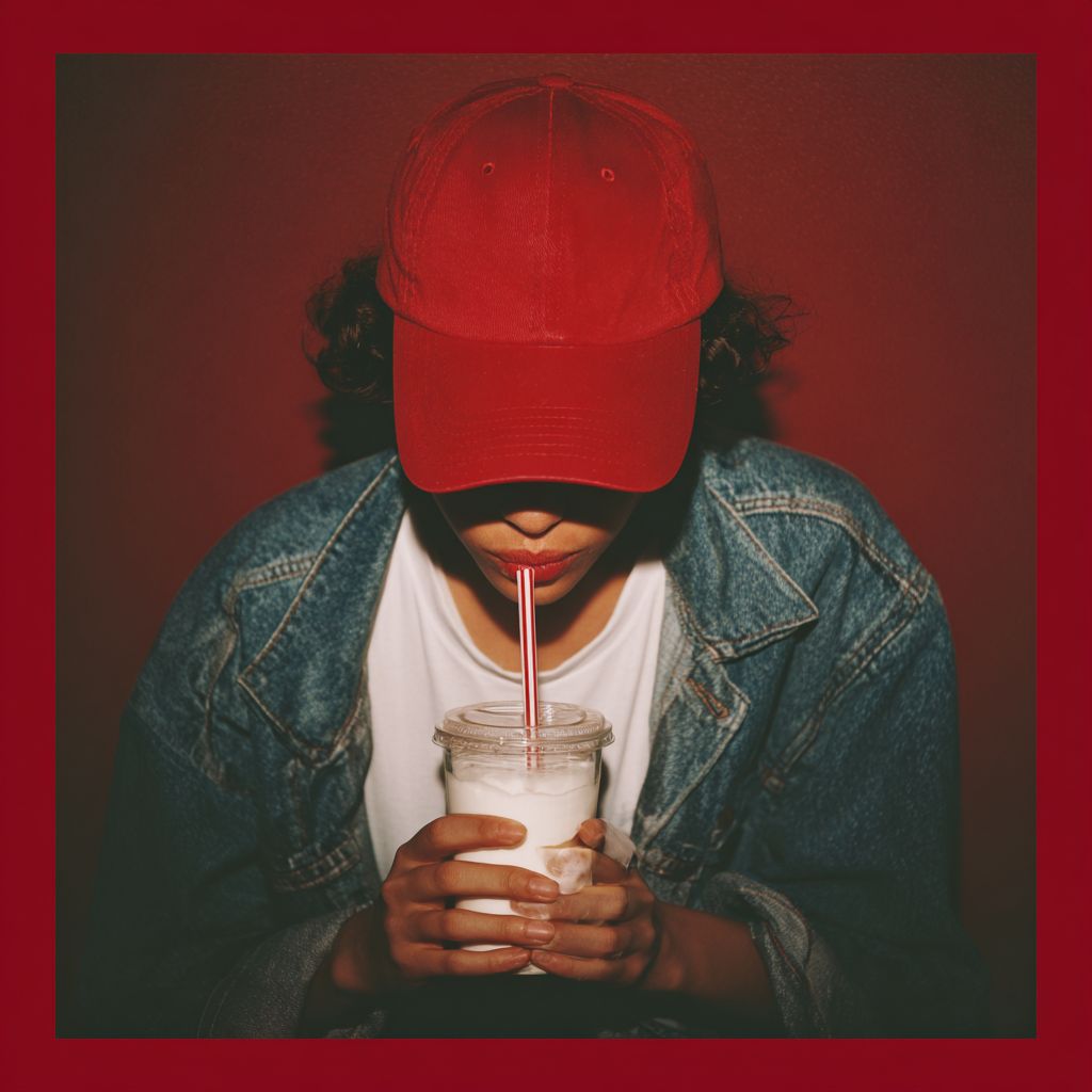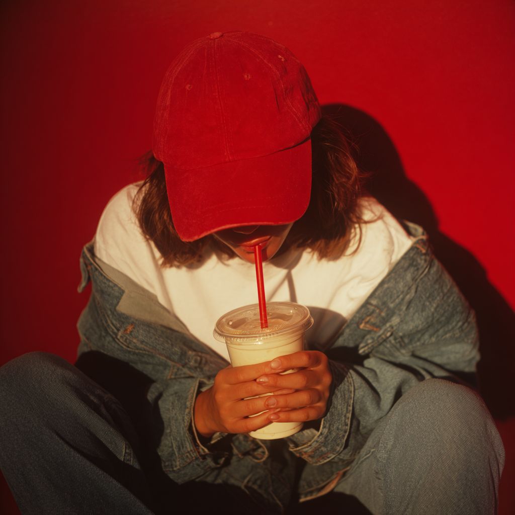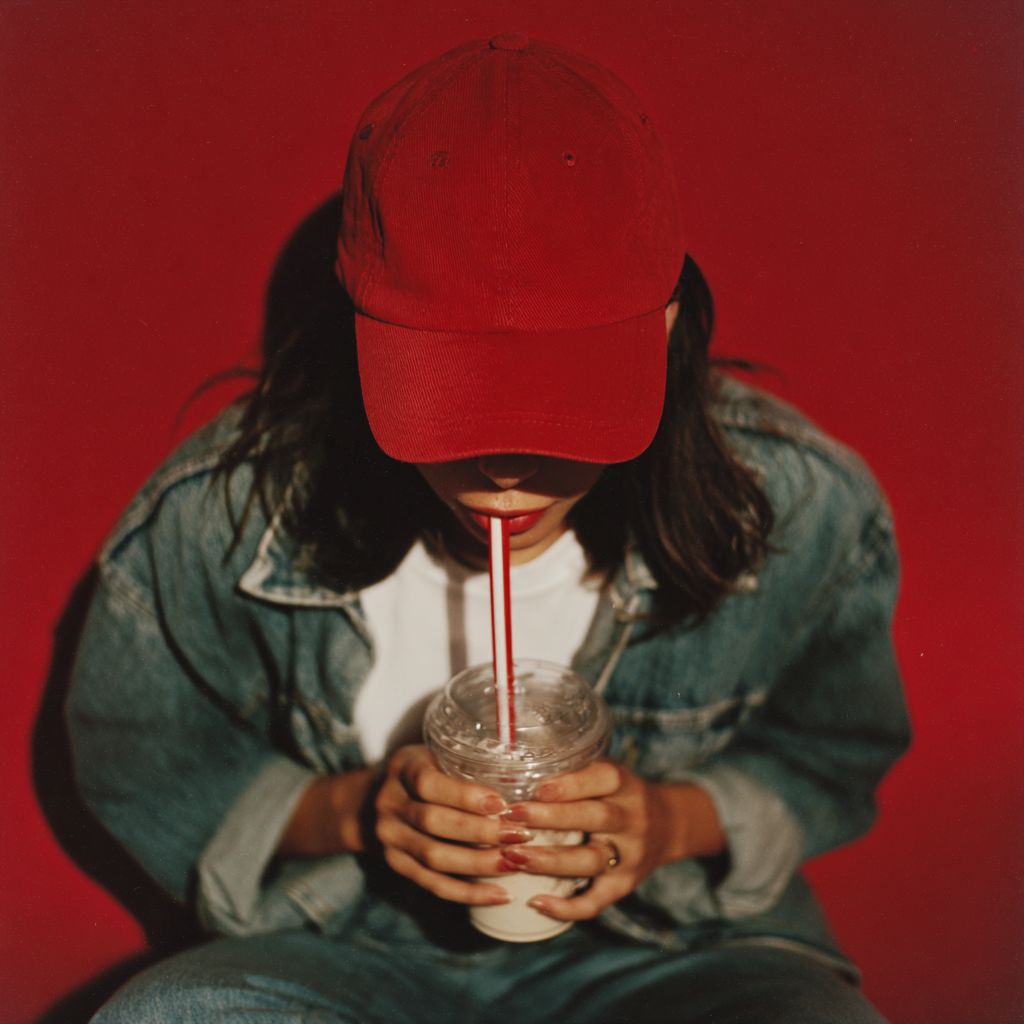 high angle, close shot photograph of a young Brazilian woman drinking a milkshake through a straw. She has her head down and is wearing a red cap that completely hides her face. white shirt and jeans jacket. red studio background. Hard flash light. Fujicolor Superia X-TRA 400.