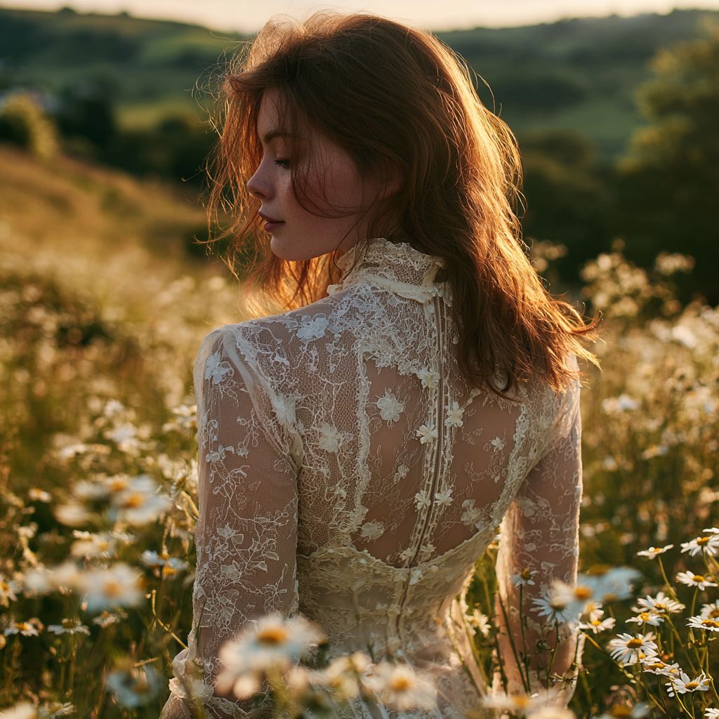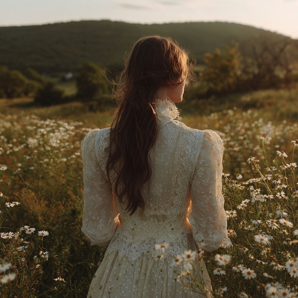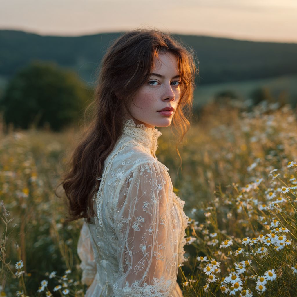На рассвете девушка в белом платье с каштановыми волосами стоит на траве, окруженная ромашками и дикими цветами. На ней изящная кружевная блузка с длинными рукавами и нежными цветочными узорами. На заднем плане находятся холмистые зеленые поля, покрытые цветущими цветами, залитые мягким золотистым светом. Фокус внимания на задней панели.