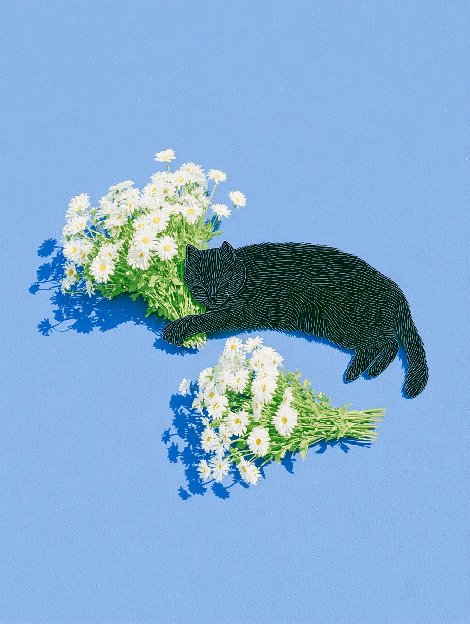 black cat just waking up with messy fur and half closed eyes while holding the flower bouquet --ar 3:4 --raw --sref 4055222462 --profile pgovlh6 --v 7.0