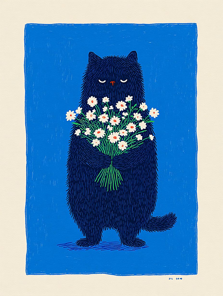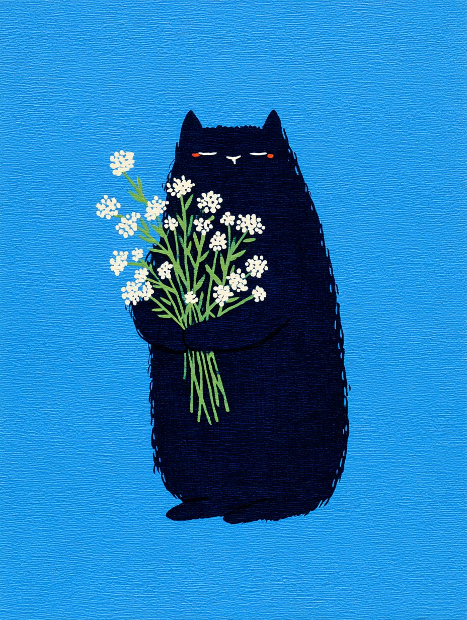 Чёрный кот только что проснулся, с растрёпанной шерстью и полузабытыми глазами, держа в руках букет цветов.