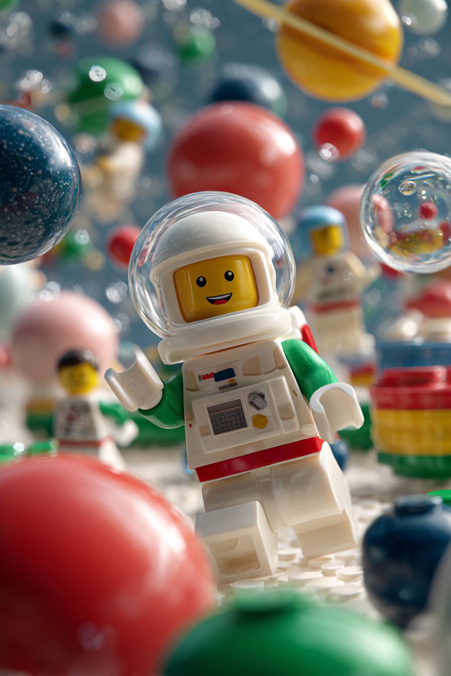 Фотореалистичное изображение космонавта LEGO, приглашающего других персонажей LEGO присоединиться к нему на бouncy планетах, на фоне которых показаны бouncy планеты и другие счастливые прыгающие дети LEGO.