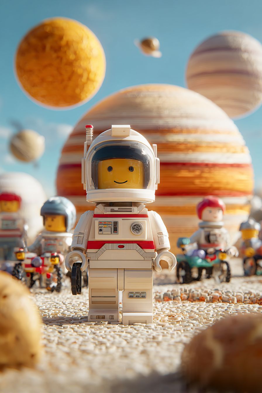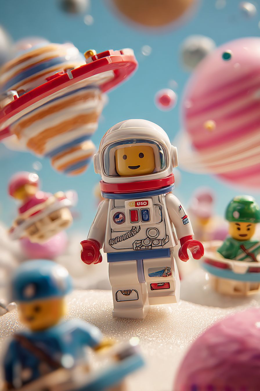 photorealistic image of a lego spaceman inviting other lego characters to join him in the bouncy planets, background shows the bouncy planets and other lego-kids bouncing happily --ar 2:3 --v 7.0