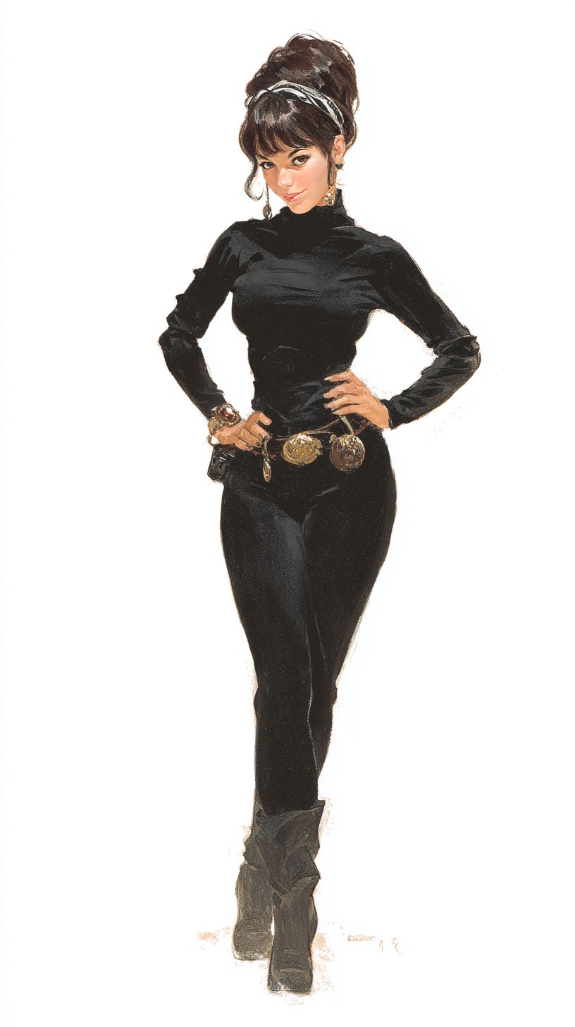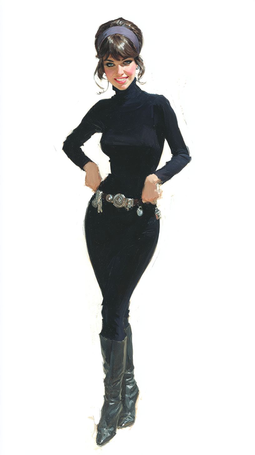 painting, in the style of Pulp covers from the 1960s, Modesty Blaise is dressed in a black bodysuit with tight black pants, she is wearing boots, she has a 1960s hairstyle with a headband, she is wearing a belt with accessories, she has her hands on her hips, she is smiling and looking at the camera, white background --ar 9:16 --v 7.0