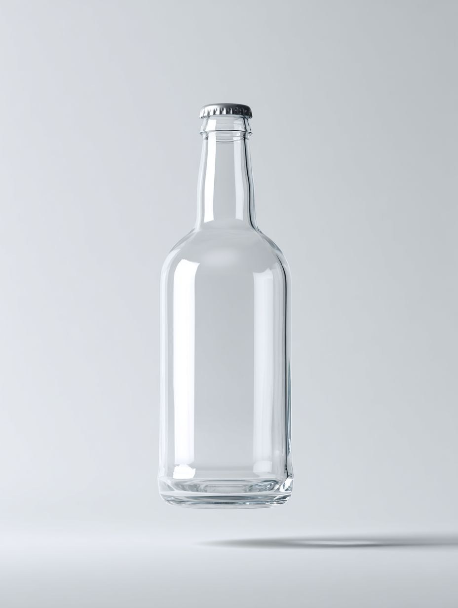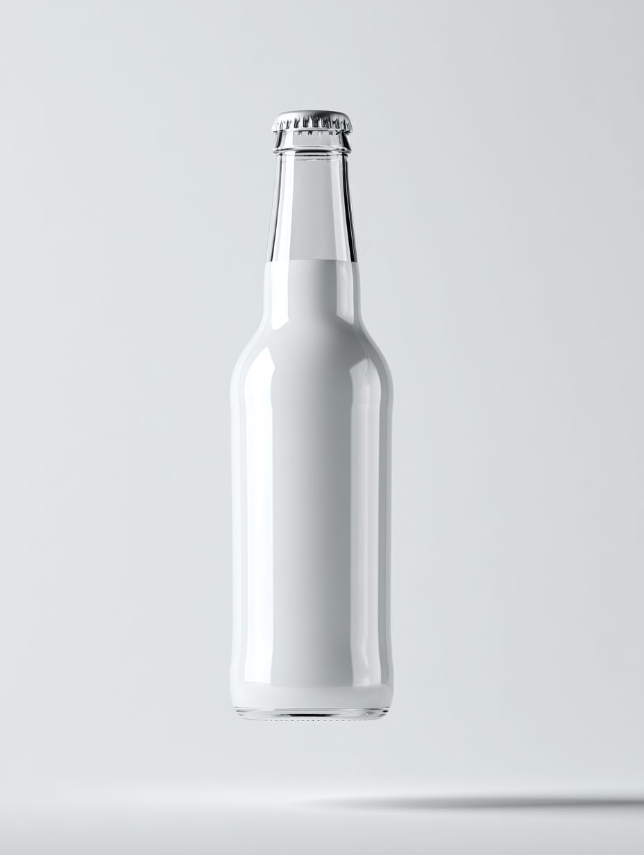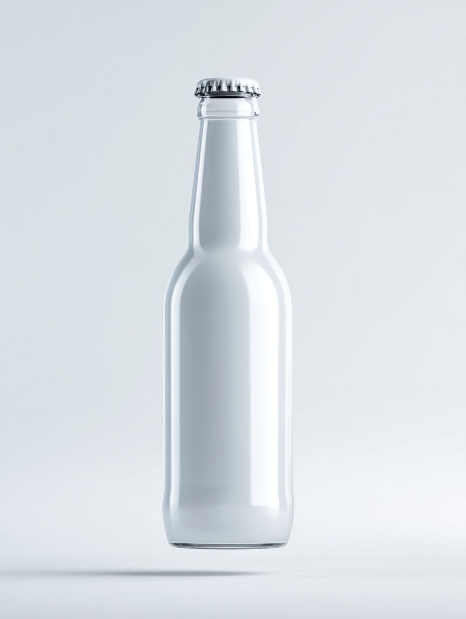 Минималистичный макет прозрачной белой матовой стеклянной бутылки алкоголя объемом 450 мл с коронной крышкой (крышка в стиле пива), левитирующей на изолированном чисто белом фоне. Чистое студийное освещение, мягкие тени, реалистичный стиль продуктовой фотографии, высокое разрешение. Бутылка находится в центре, показана под прямым углом, с простой и элегантной формой, без ярлыка, без текста. Современная премиум-эстетика дизайна, резкие детали, фотореалистичность.