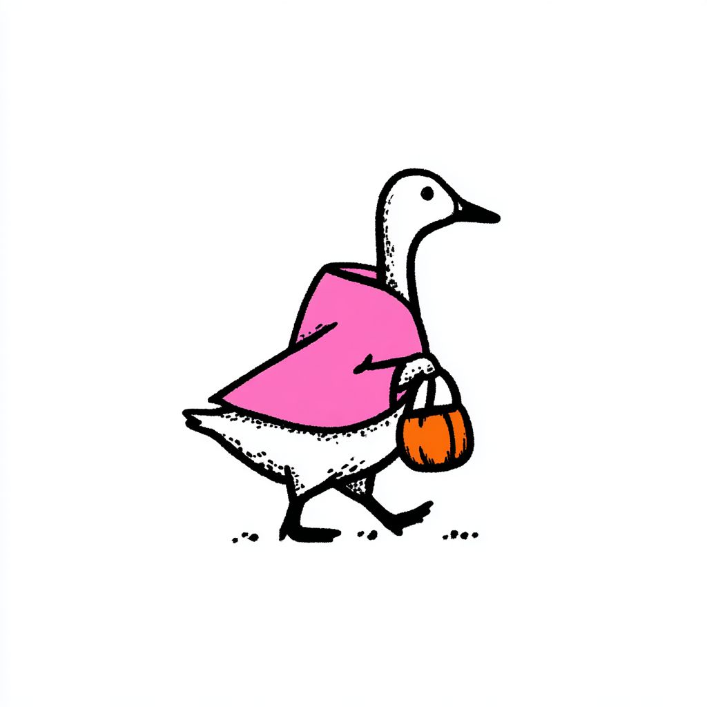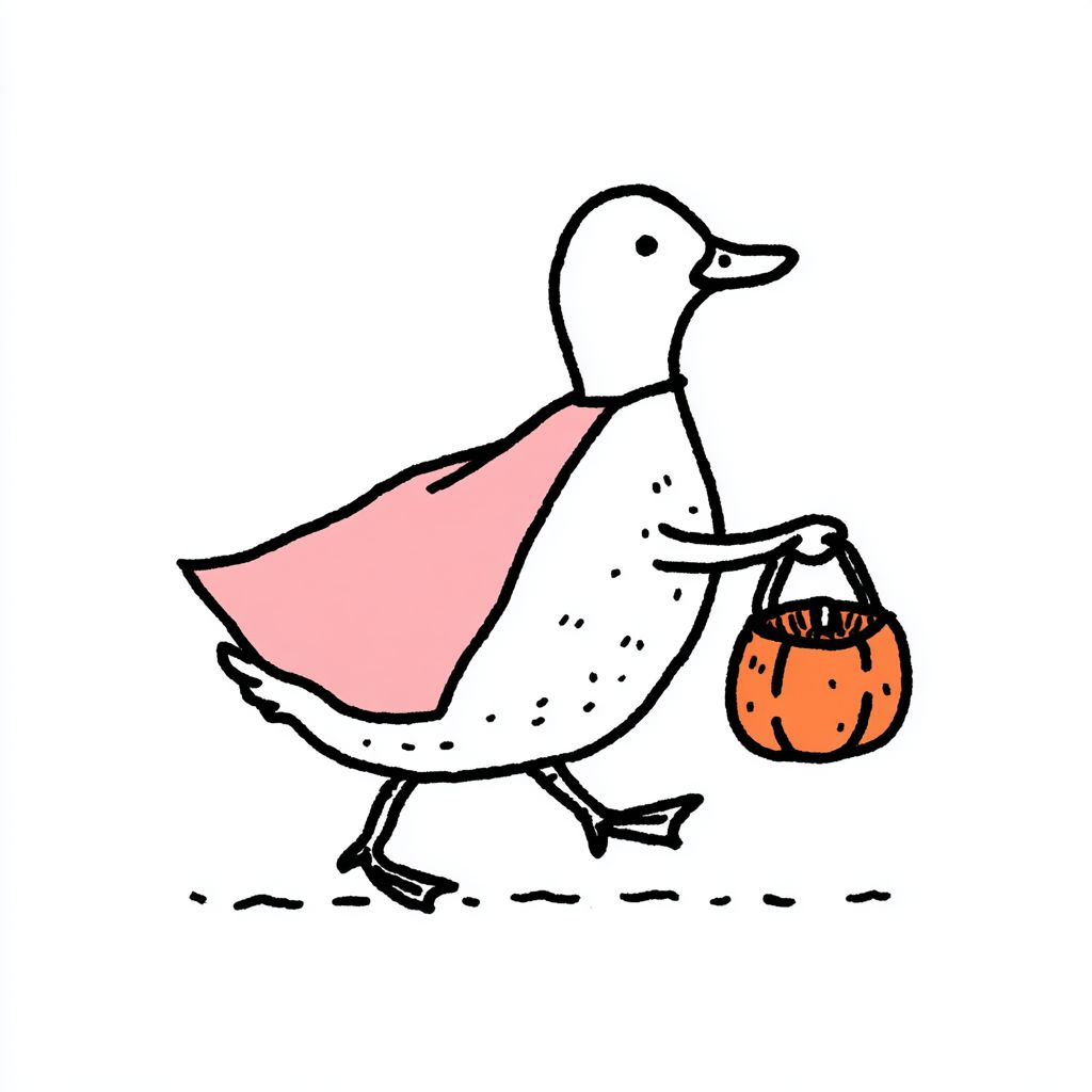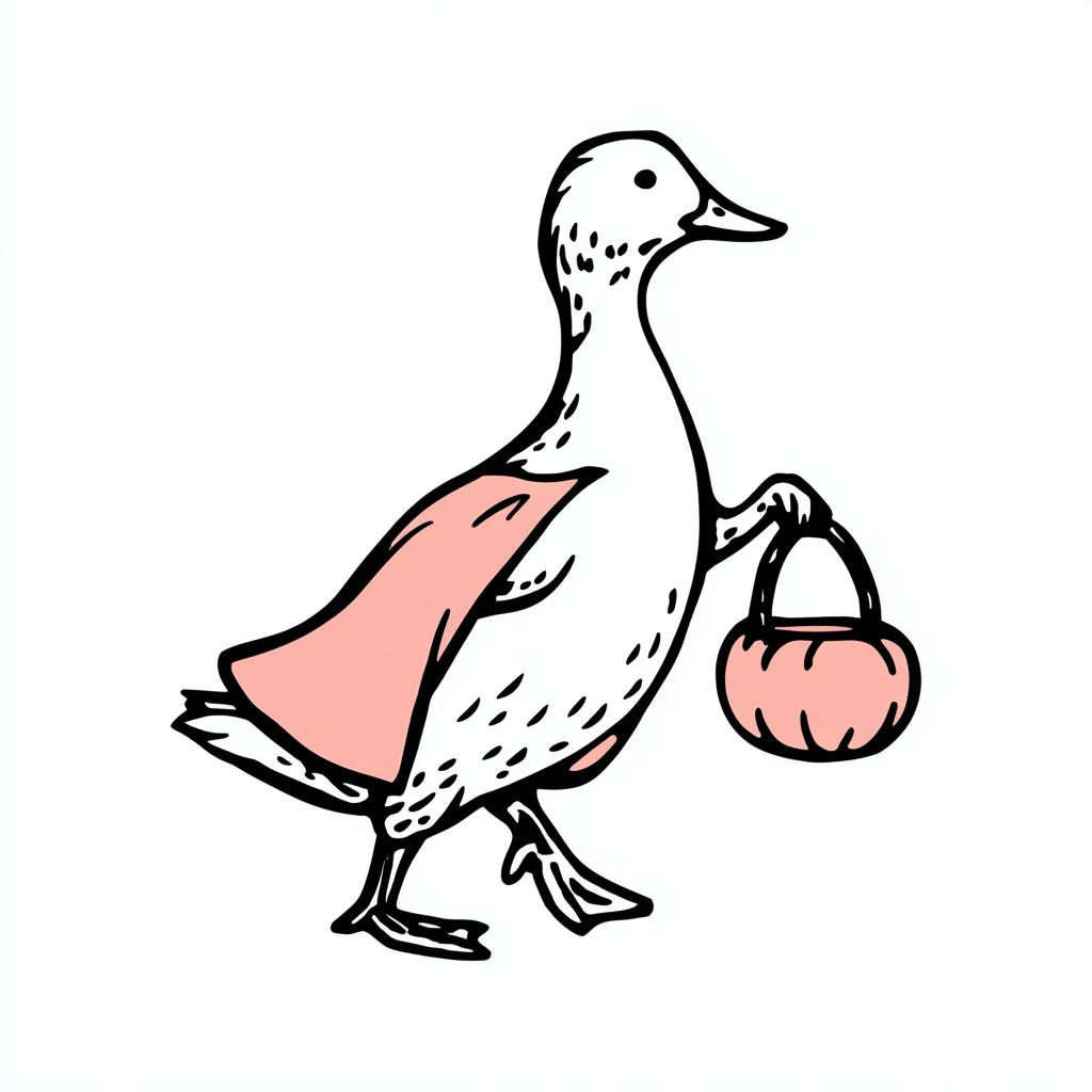 A simple and clear black line drawing of an adult duck with a pink cape on its back, holding a pumpkin basket in its hand and walking in one direction. Simple PNG. White background. --v 7.0