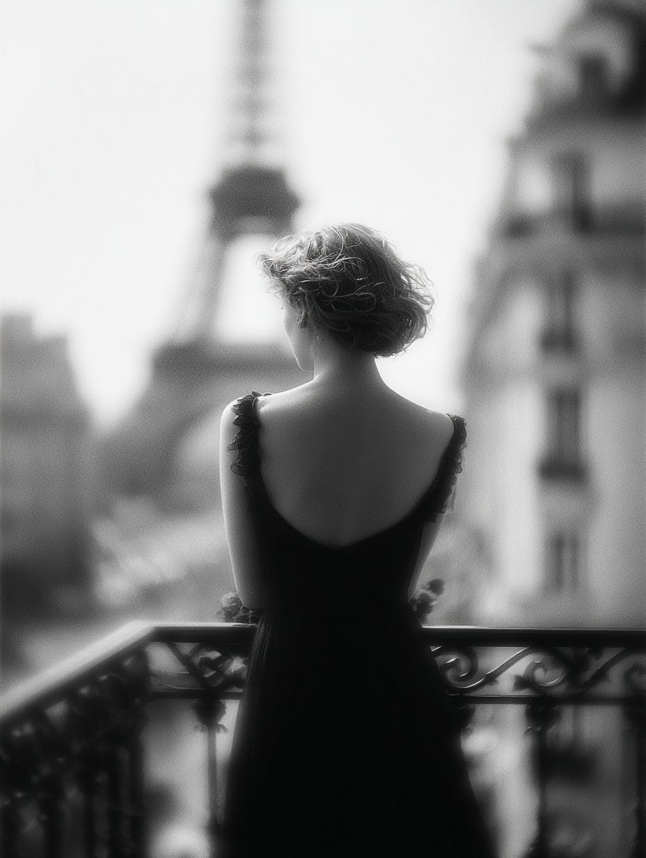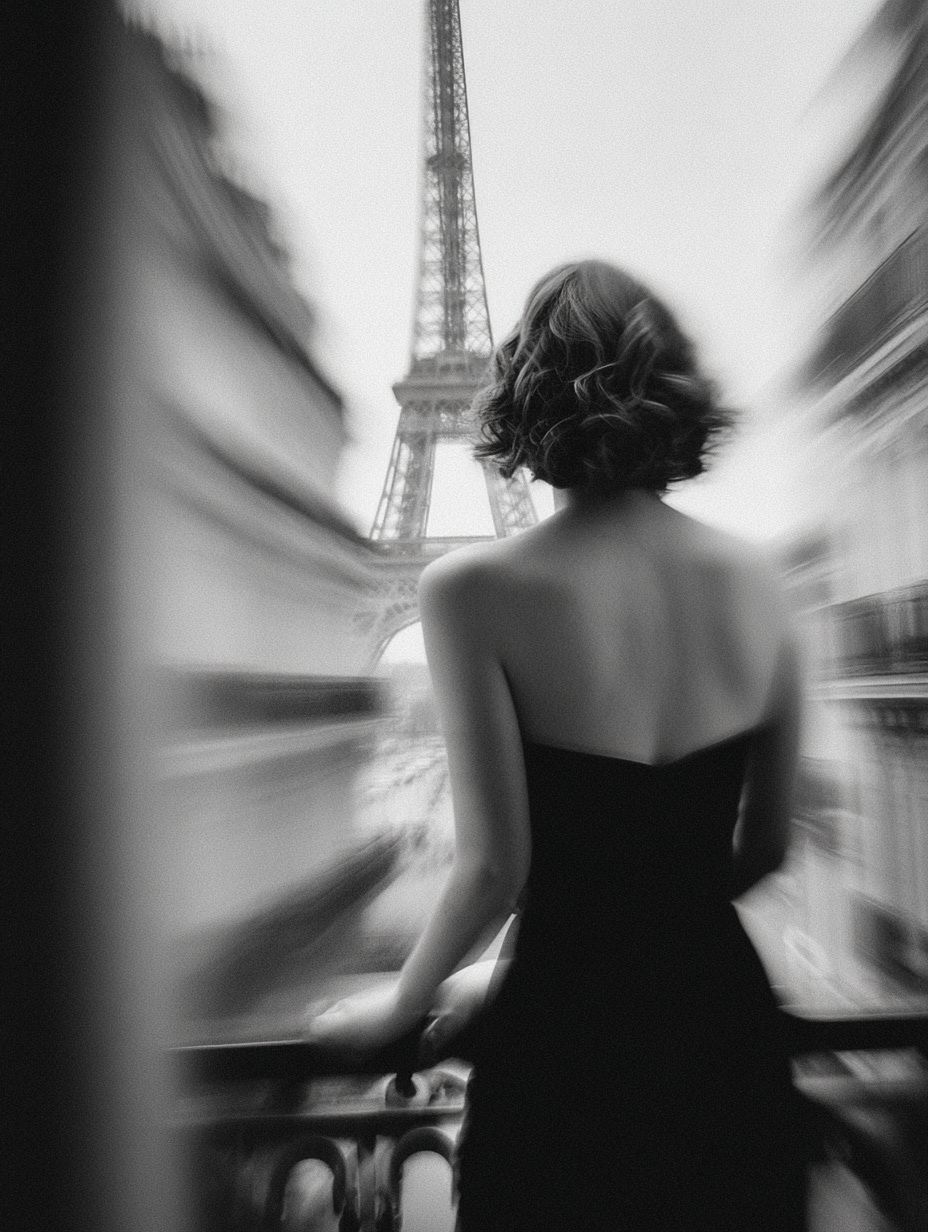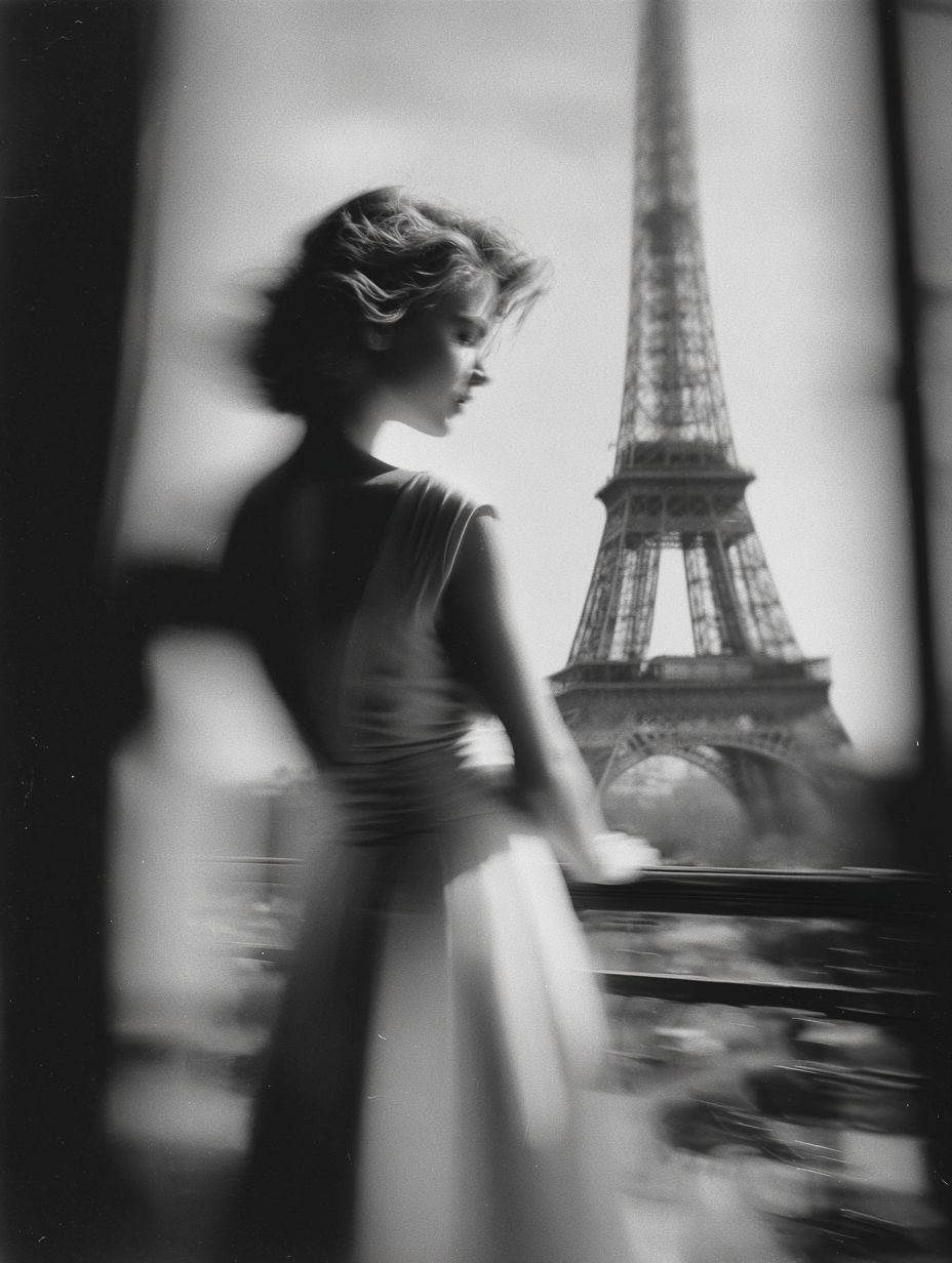 Фотография высокой четкости в черно-белом цвете для редакционных модных изданий, размытой портретFemale модели со светлой кожей, изысканными волосами, одетая в элегантное платье, стоящая на французском балконе и глядящая на Эйфелеву башню, спиной к камере. Мягкий рассеянный свет и эффекты размытия движения, мечтательное и экспериментальное настроение, эстетика 1995 года, сделанная на Ilford HP5 Plus 400, монохромная палитра глубокого черного, мягкого серого и белых бликов.