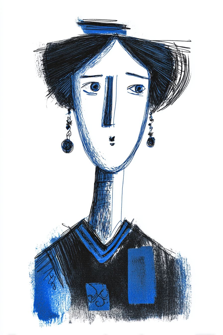 Арт в стиле души, нарисованное от руки линейное искусство, стиль дудлов, минимализм, обведенное прусским синим, портрет китайской женщины конца династии Цин с юмористическими и необычными чертами, большой головой и длинной шеей. Неработанные штрихи и случайные цветные блоки усиливают комедийный эффект... эскиз, шедевр, на белом фоне.
