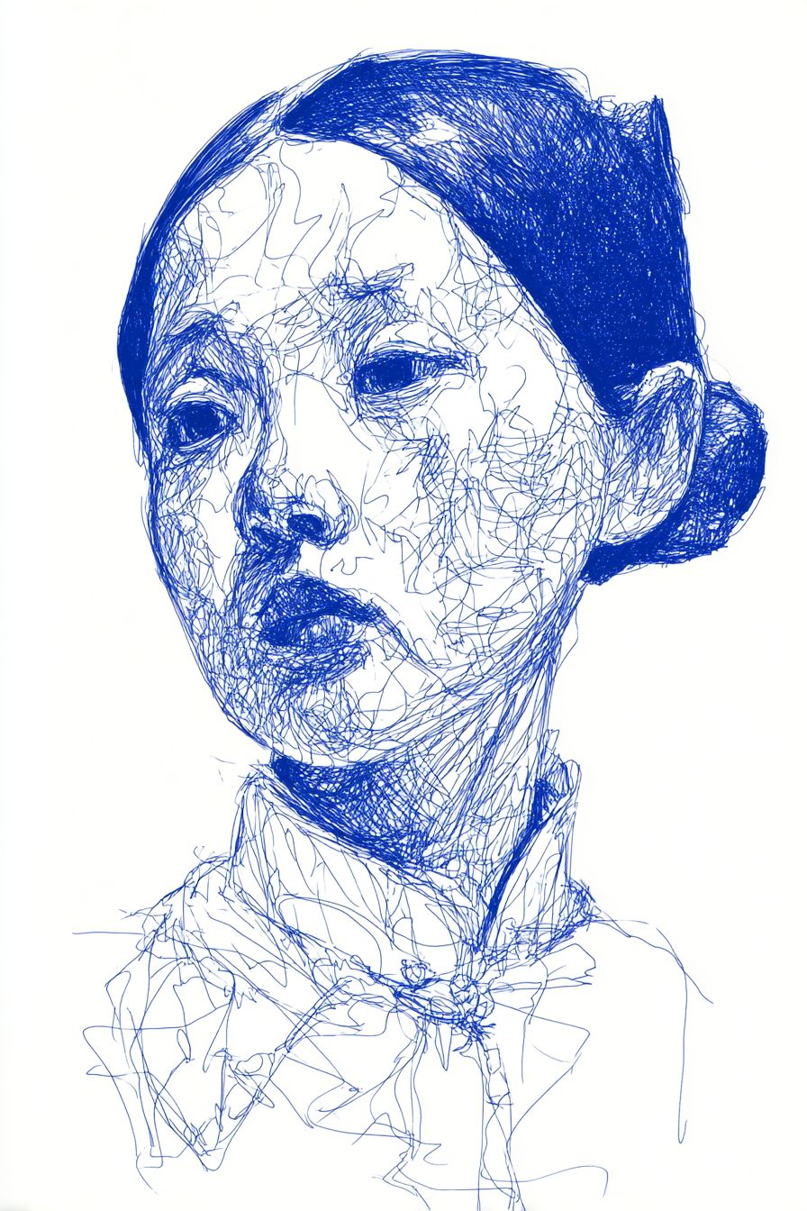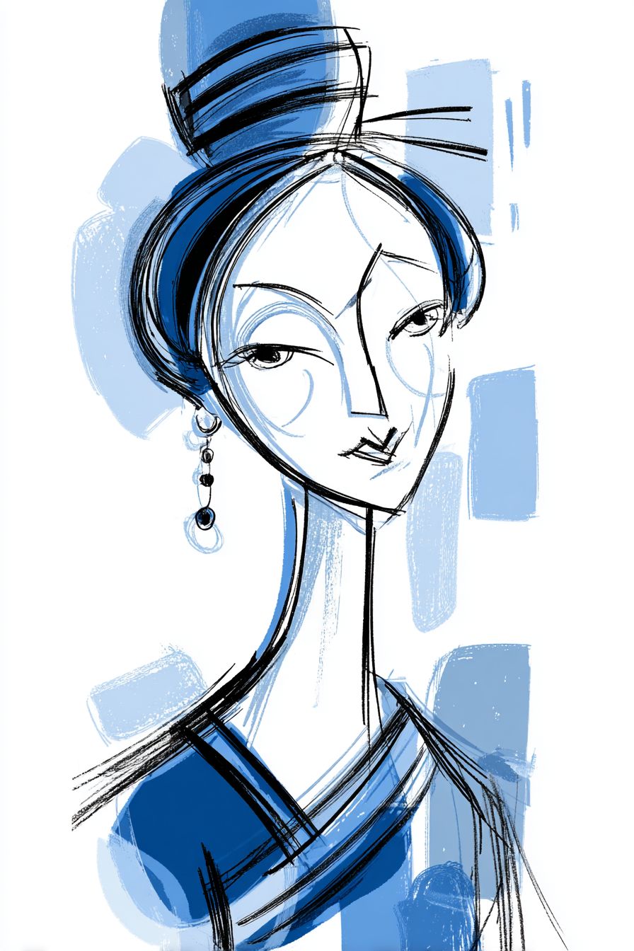 Минималистский набросок, набранный в прусском синем, изображающий юмористический портрет китайской женщины с конца Цинской династии
