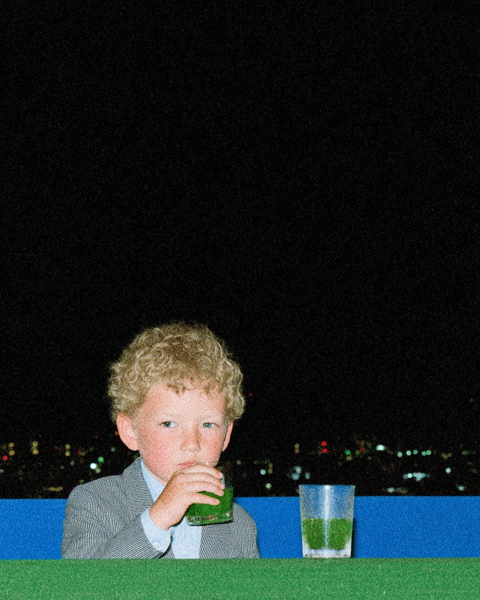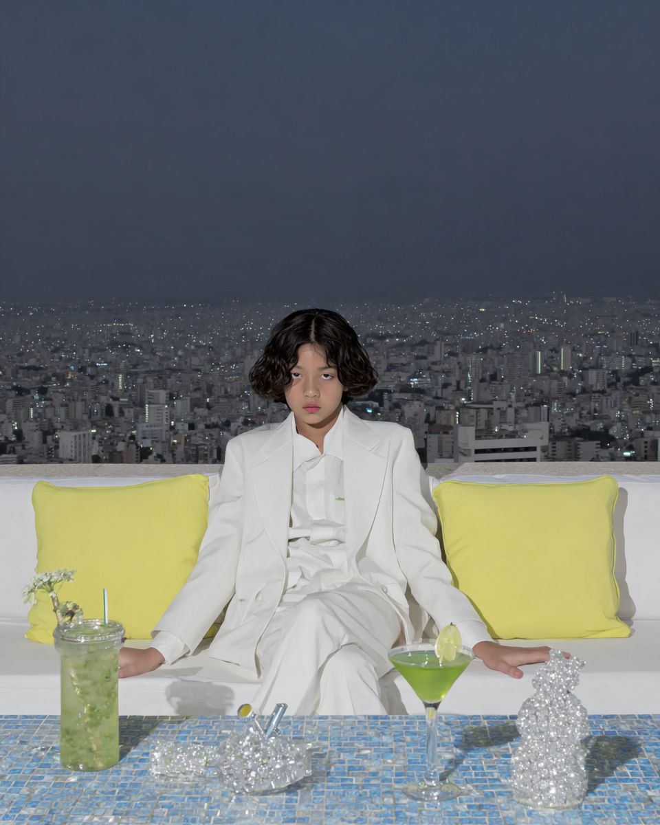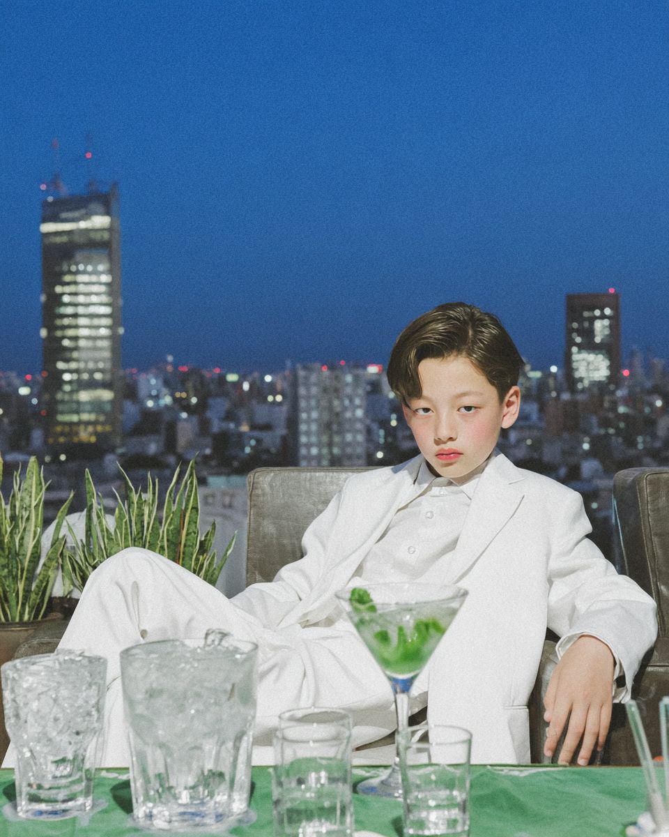 Рекламная фотография молодого детского модели, позирующего на крыше роскошного отеля. Он смотрит в камеру в костюме Yojhi Yamamoto. Стиль - 80-е, рядом с ним коктейль и стеклянное украшение, создающее ощущение высокой жизни. Освещение – вспышка от камеры и задний свет.