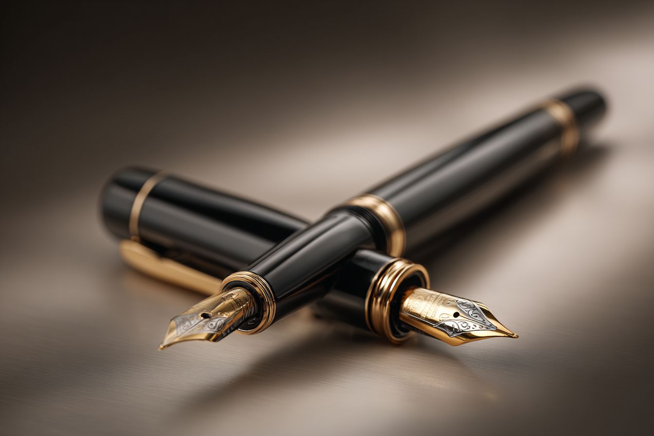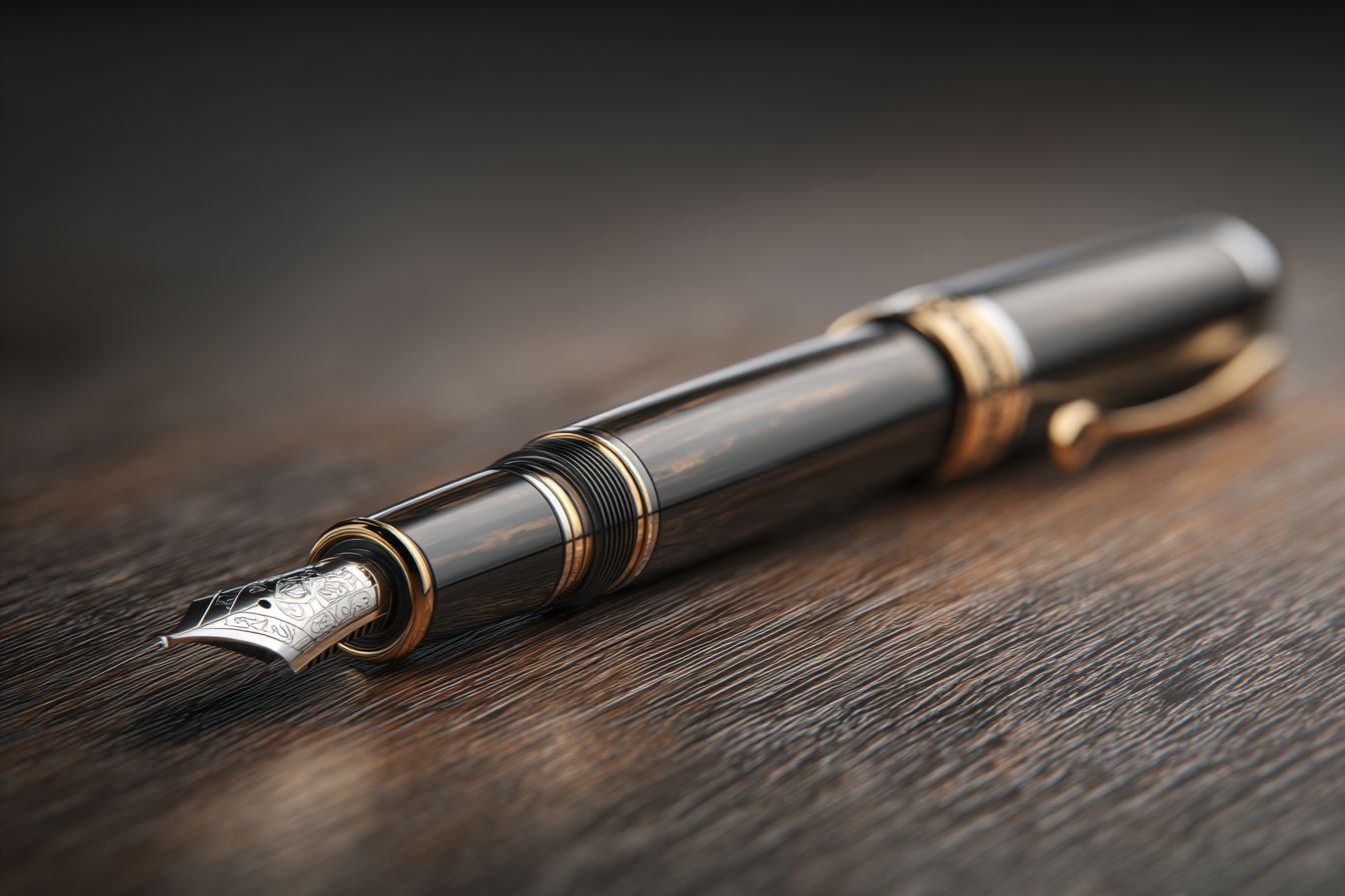 Studio shot of a luxury fountain pen, elegantly positioned on a walnut desk surface, soft ambient shadows, smooth gradient backdrop, high-key lighting, shallow depth of field, ultra-sharp focus on the subject, subtle reflections, minimal aesthetic, professional DSLR, premium commercial lighting setup, optimized for high-end product presentation --ar 3:2 --v 7.0