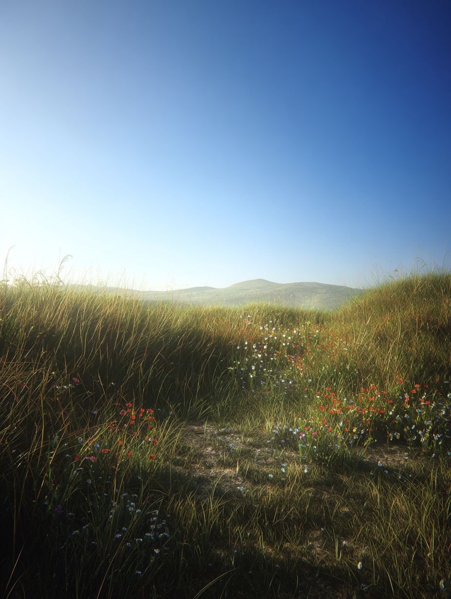 Фотореалистичное изображение органского луга под ясным голубым небом, мягкий солнечный свет отбрасывает нежные тени, киношная композиция, ультрареалистичный стиль высокоразрешающей фотографии.