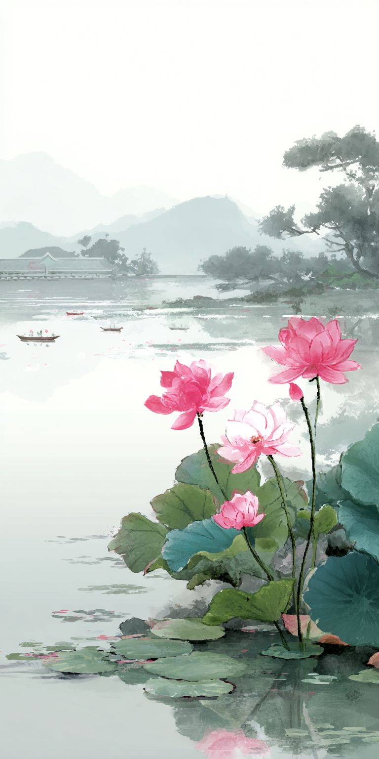 Это мобильный фон в китайском стиле с светло-розовыми лотосами, расположенными в правом нижнем углу, общий стиль прост, но изыскан