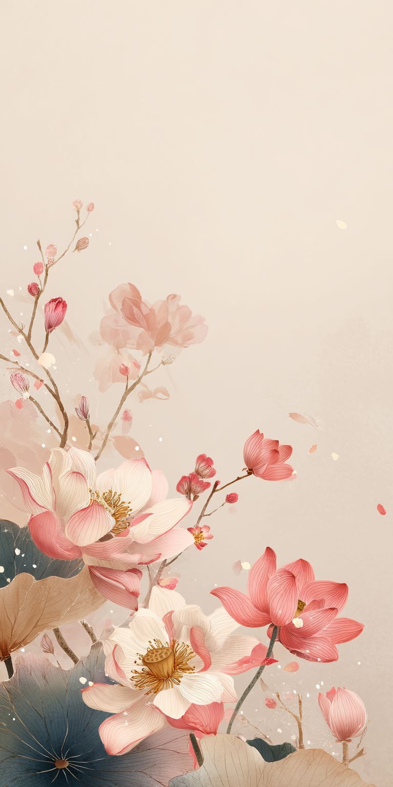 Обои для мобильных телефонов в китайском стиле с легкими розовыми лотосами в качестве темы, лотосы расположены в нижнем правом углу экрана на светлом фоне. Используются тонкие мазки кисти, стиль ручной иллюстрации, мягкое освещение и эффект акварели с высоким разрешением. Общая композиция проста, но изысканна, красивые детали придают теплоту всей сцене, а пустое пространство составляет 50%.
