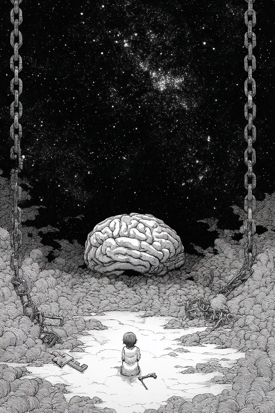 Человеческий мозг покоится на мягком плотном облачном полу, плотно обwrapped в толстые металлические цепи, которые все сходятся в большом замке. Перед замком стоит небольшая человеческая фигура, держащая большой ключ обеими руками, с решимостью смотрящая на него. Сцена под темным звездным ночным небом передает тайну, надежду и самоанализ. Черно-белая манга, высокая контрастность оттенков чернил, тонкие линии, драматическое освещение, эмоциональная атмосфера, детализированный фон, вертикальная композиция, стиль обложки книги.
