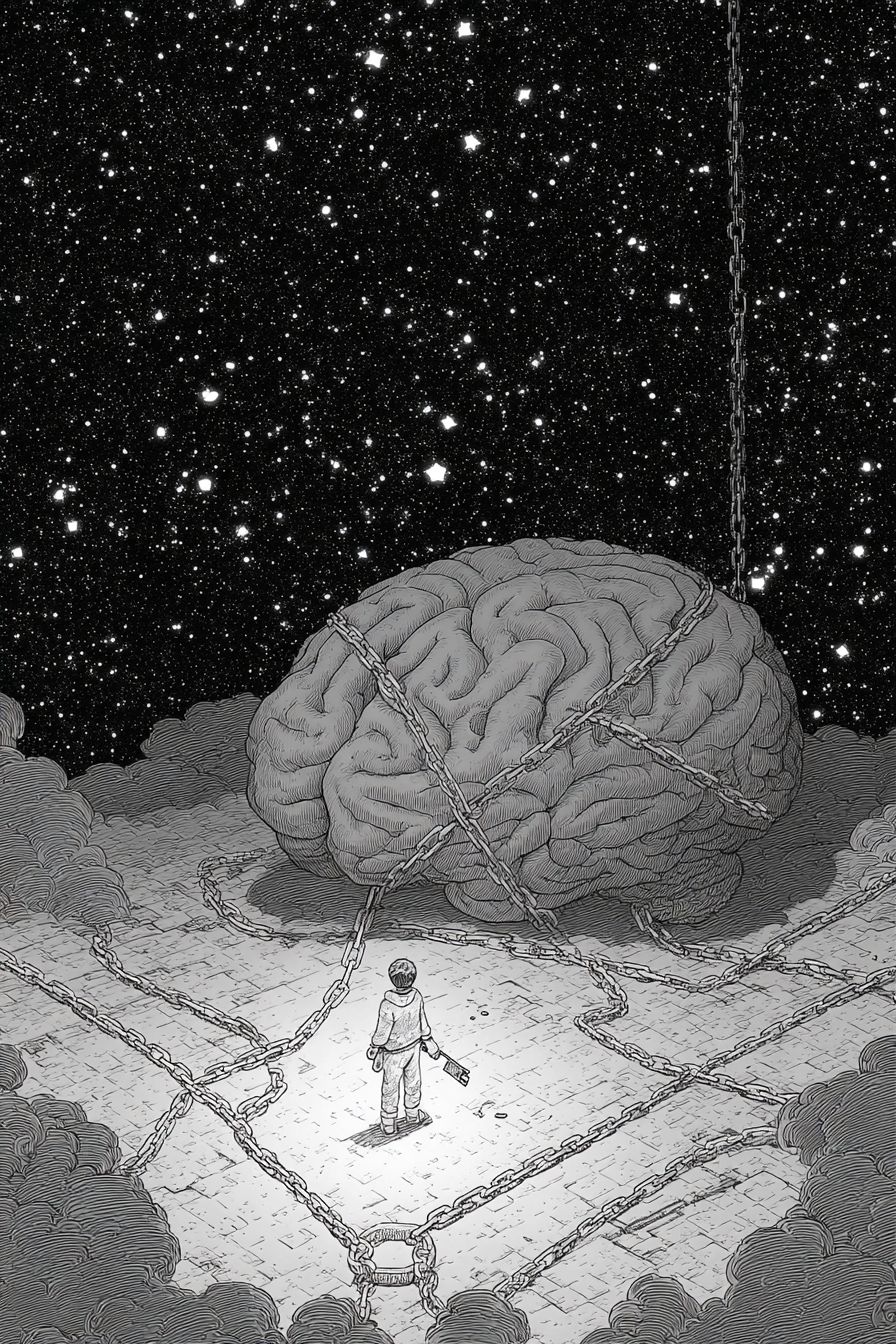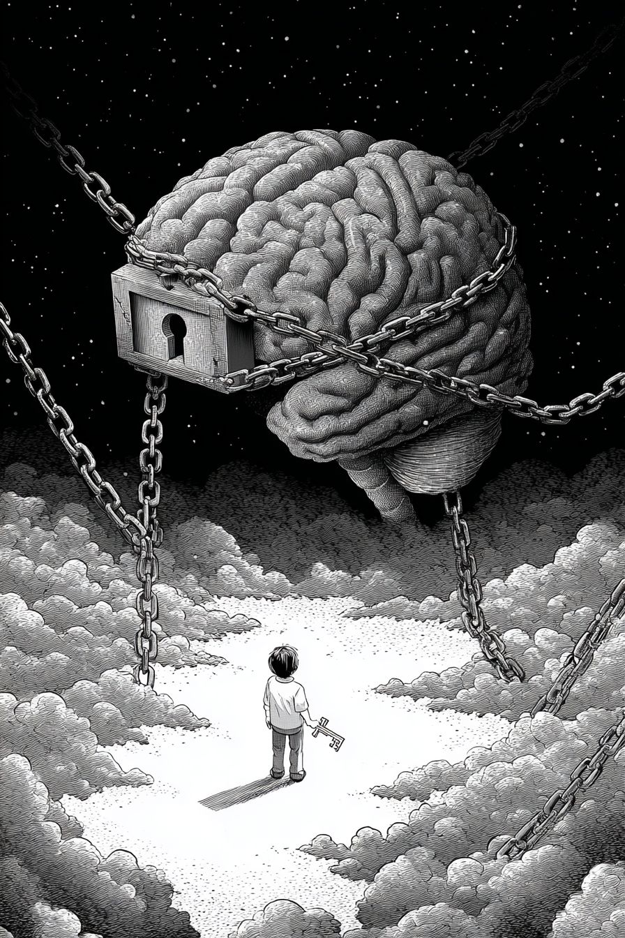 A human brain resting on a floor of soft dense clouds, wrapped tightly in thick metal chains that all converge into a large padlock. In front of the padlock stands a small human figure holding a large key in both hands, facing it with determination. The scene is under a dark starry night sky, conveying mystery, hope, and introspection. Manga black and white illustration, high contrast ink shading, fine linework, dramatic lighting, emotional atmosphere, detailed background, vertical composition, book cover style, --chaos 15 --ar 2:3 --raw