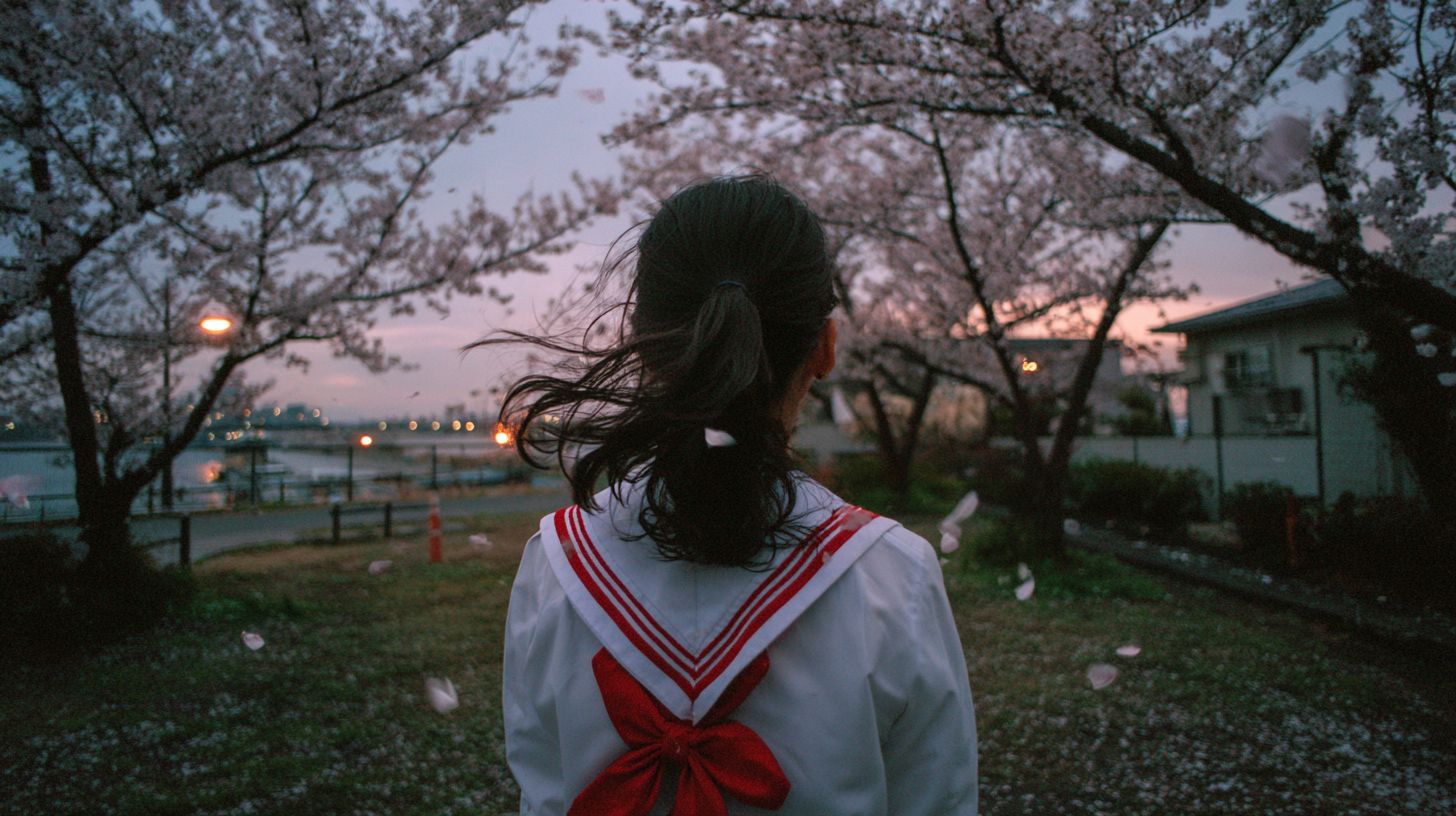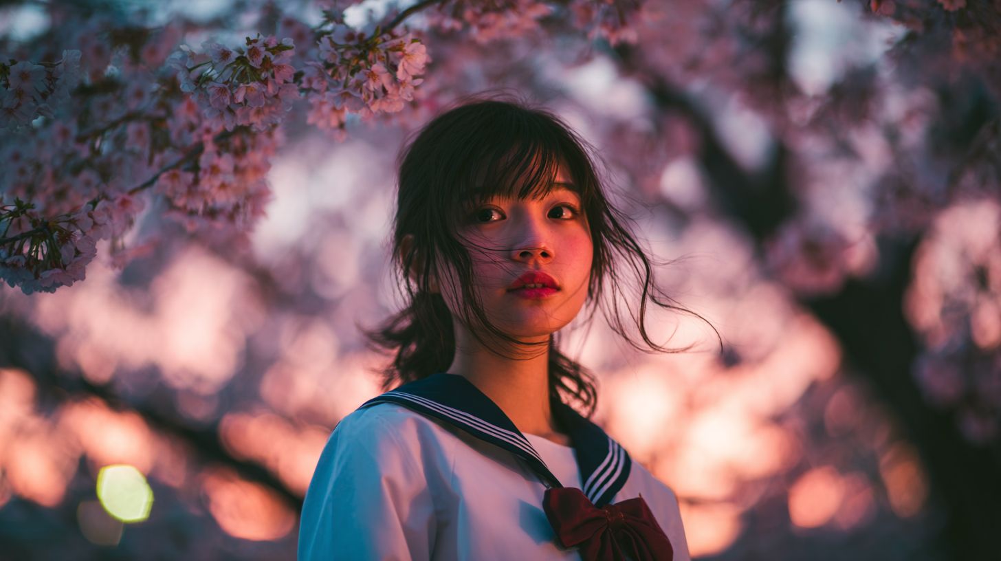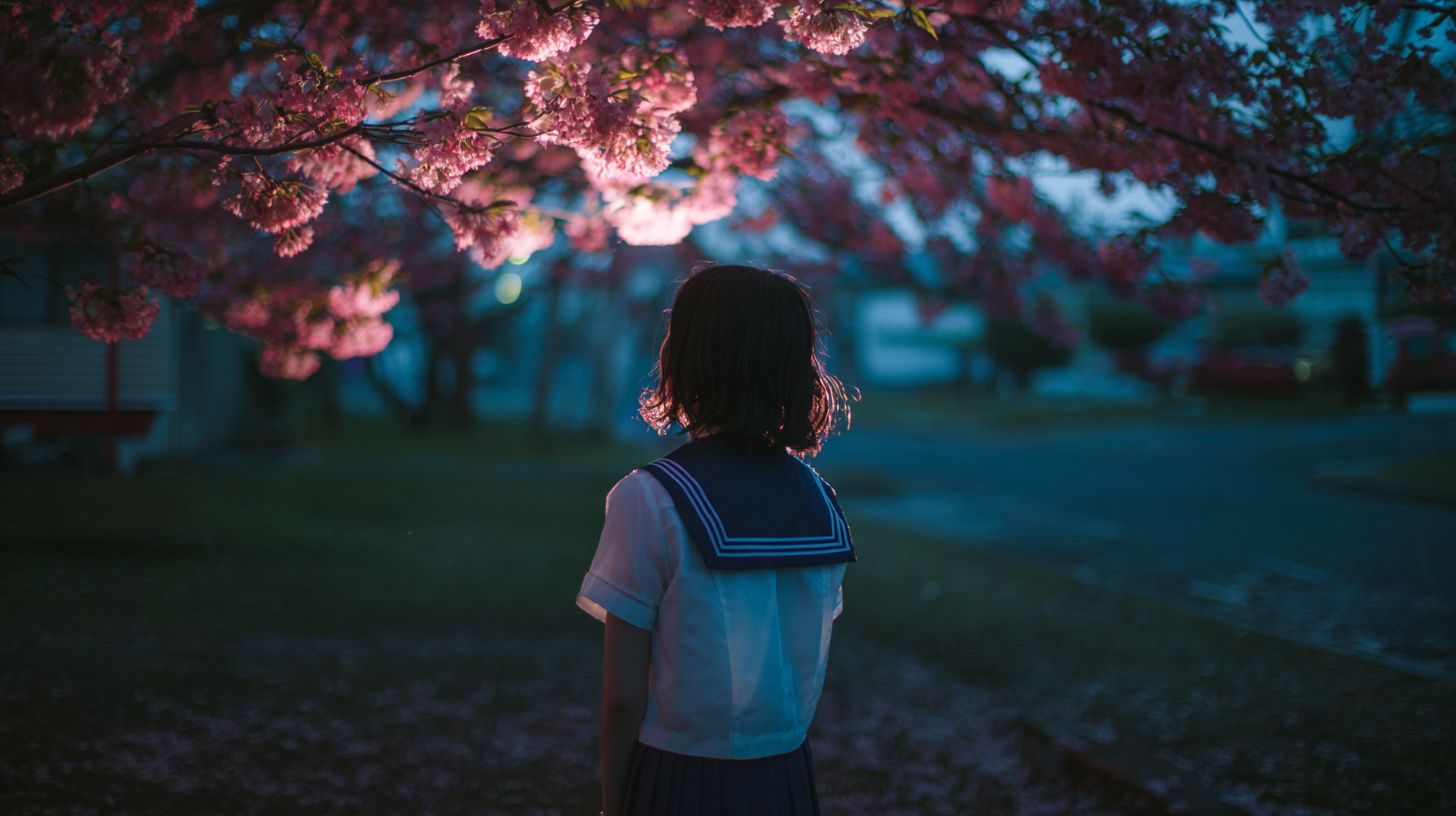 A solitary Japanese high school girl in crisp sailor uniform, standing under cherry blossoms at dusk, soft wind tousling her hair, high-ISO film grain and low contrast that create a distinctive, story-like atmosphere --ar 16:9 --v 7.0