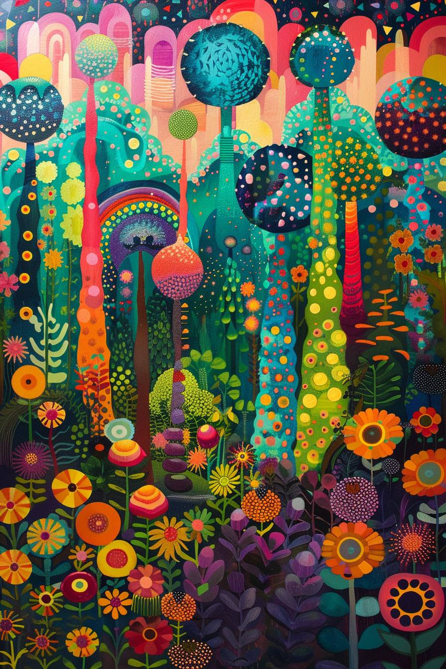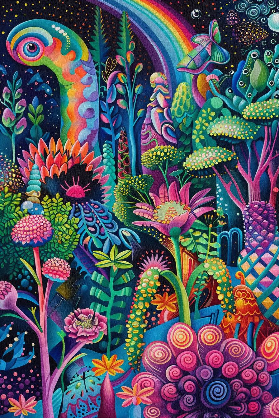 an enchanted garden with flowers, trees, and animals composed of bright, geometric patterns. The plants and creatures have a 3D appearance, giving depth to the garden, a patterned sky with a rainbow. --ar 2:3 --v 6.0