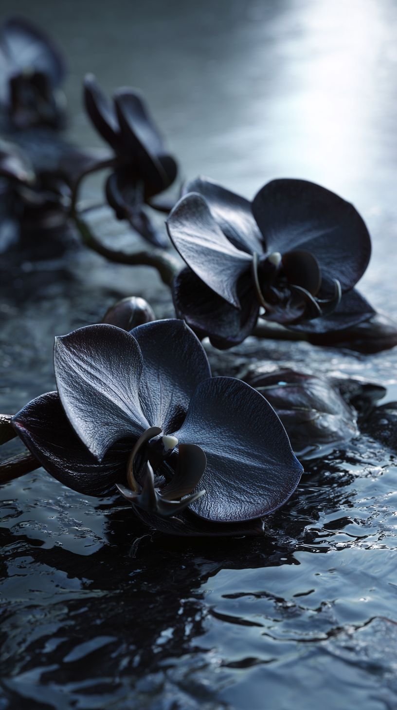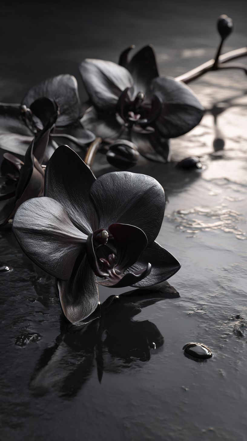 hyperrealistic cinematic product scene for Tom Ford campaign, a long branch of pure black orchids lying on a glossy black resin-like watery surface, photographed in perspective view with strong visual depth so the camera could move along the branch toward the distance, dramatic moody lighting with high contrast between light and shadow, a narrow beam of light illuminating the orchid petals and glossy reflections on the black liquid, dark atmospheric background fading into deep shadow, ultra-detailed velvet texture on the black petals, realistic reflections and subtle ripples on the surface, natural imperfections, deep cinematic depth of field, luxurious minimal composition, professional high-fashion editorial photography, perfect for cinematic camera movement, hyperrealism, shot on Hasselblad H6D, --ar 9:16 --raw --v 7.0
