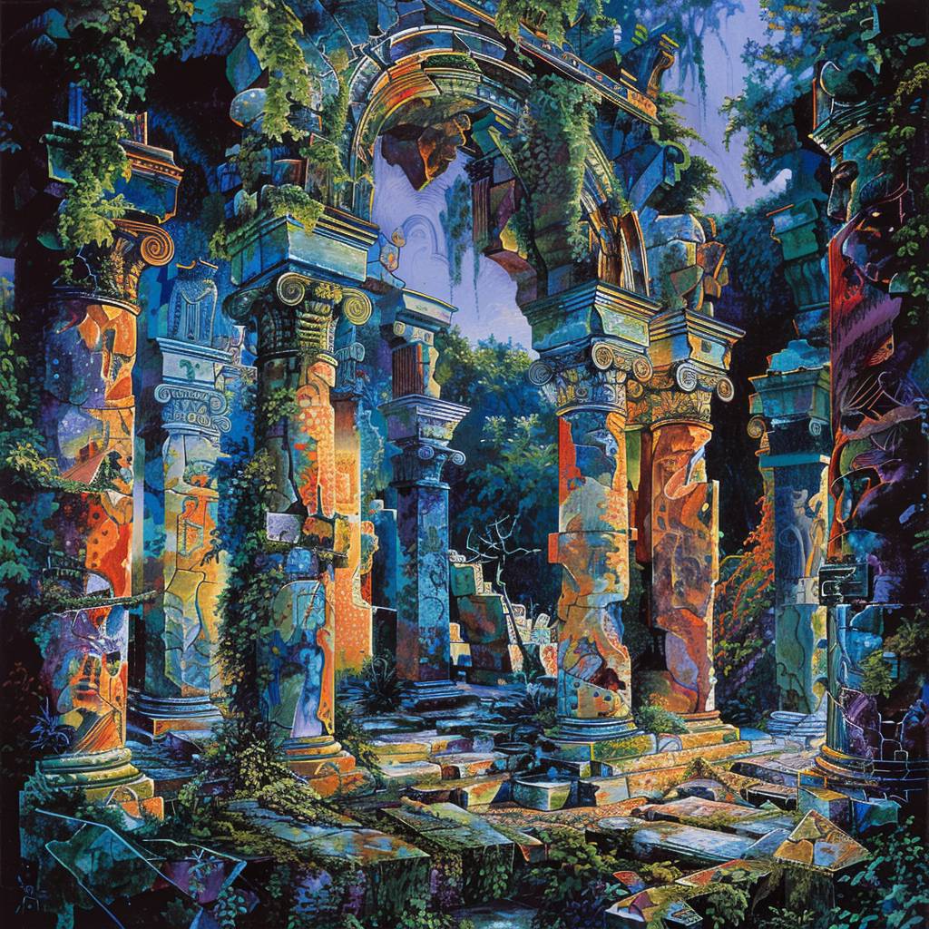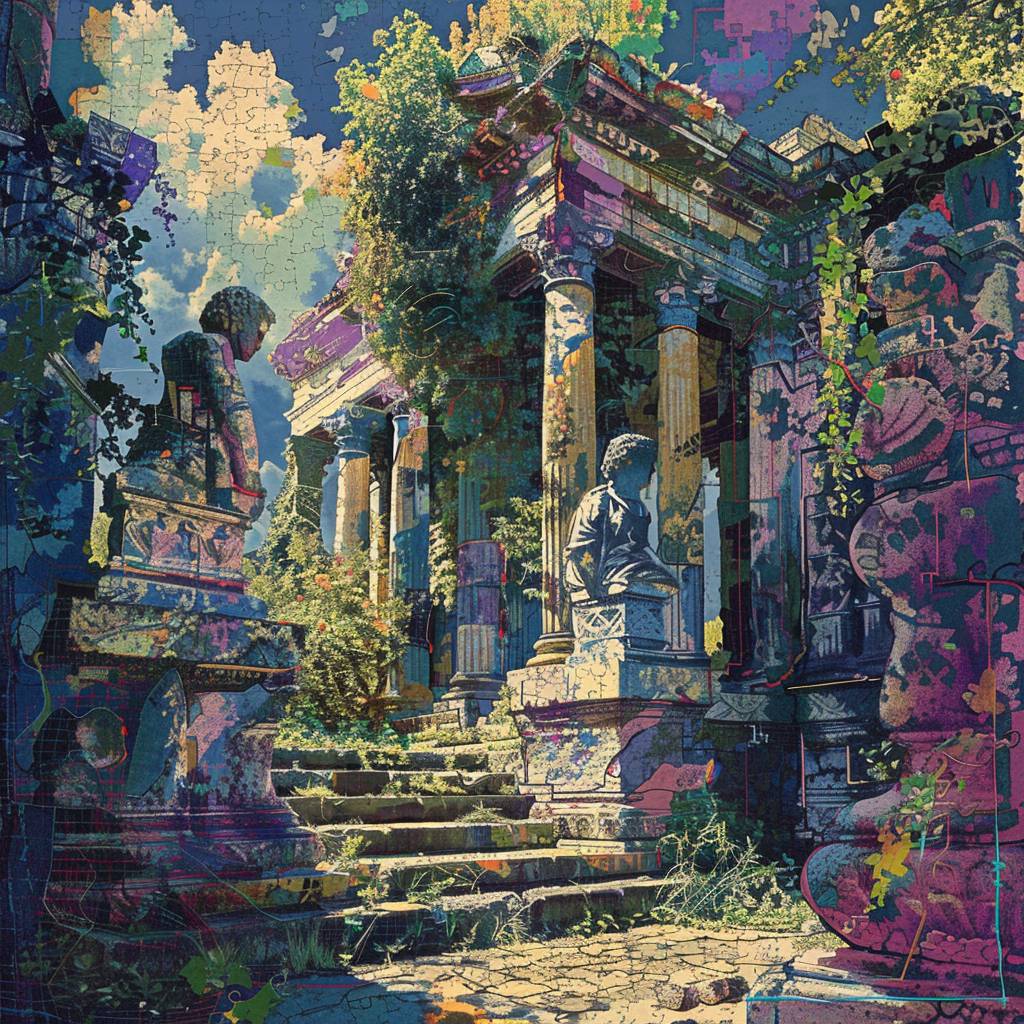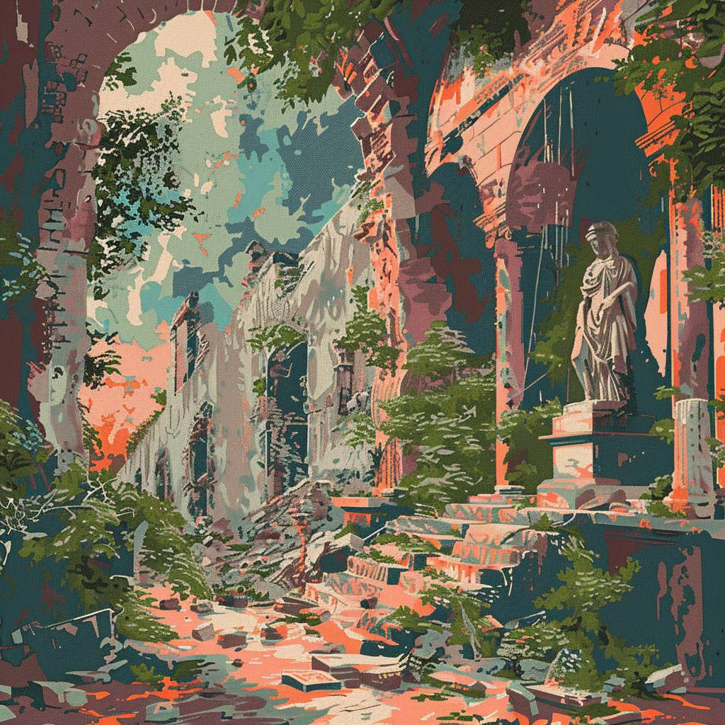 Древние руины с обветшалыми сооружениями, статуями и заросшими виноградными лозами, состоящие из ярких, цветных узоров, руины имеют 3D-эффект, создающий ощущение истории и тайны.