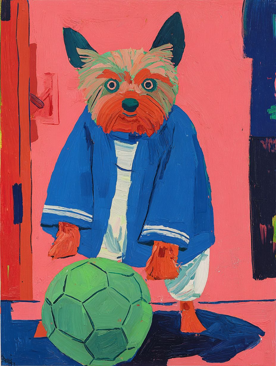 Yorkshire Terrier, small and round face. The eyes are large and have pointed ears, 23 cm in size, 2.4 kg in weight, Yorkshire Terrier's fur color is dark yellow-brown on head and legs, navy blue on body, straight and soft silk hair grows long from nose to tail, splits downwards, has a mild, nice and smart personality, Yorkshire Terrier is kicking a ball and having fun alone, and the background color is rose pink. Draw eyes, nose, mouth, posture and clear, and bright eyes of Yorkshire Terrier --ar 3:4 --sref 1699911579 --profile ffhyfqk --s 50 --v 7.0