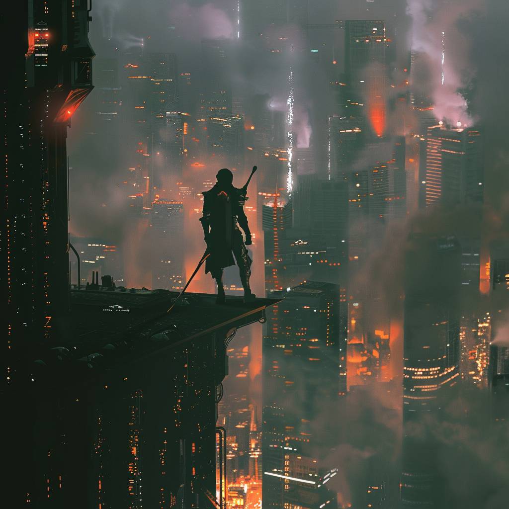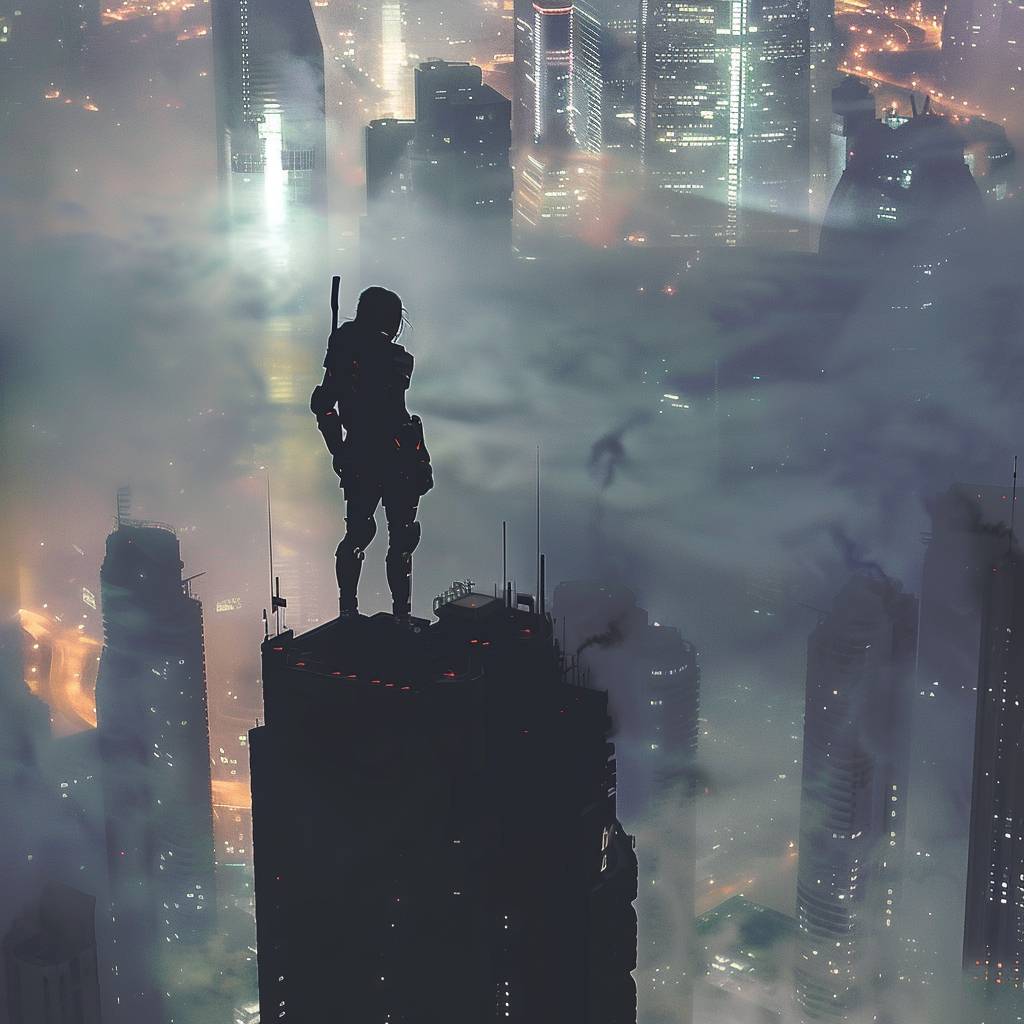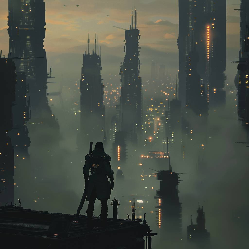 Силуэт воина, стоящего на краю и смотрящего на футуристский дистопийный городской горизонт, окутанный туманом и дымкой, с небоскребами, возникающими из тумана, и светящимися огнями на фоне.