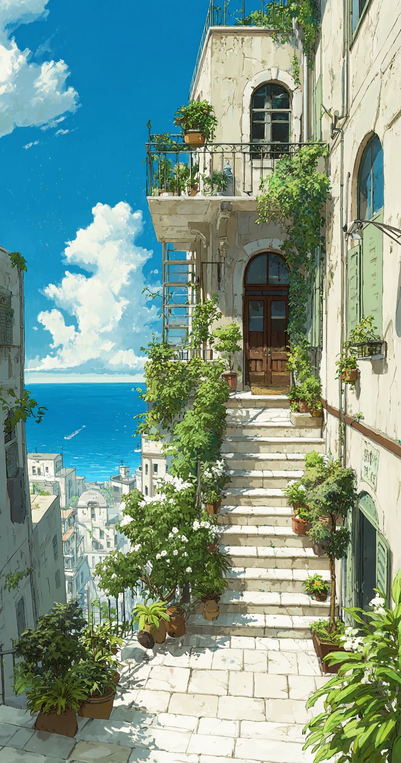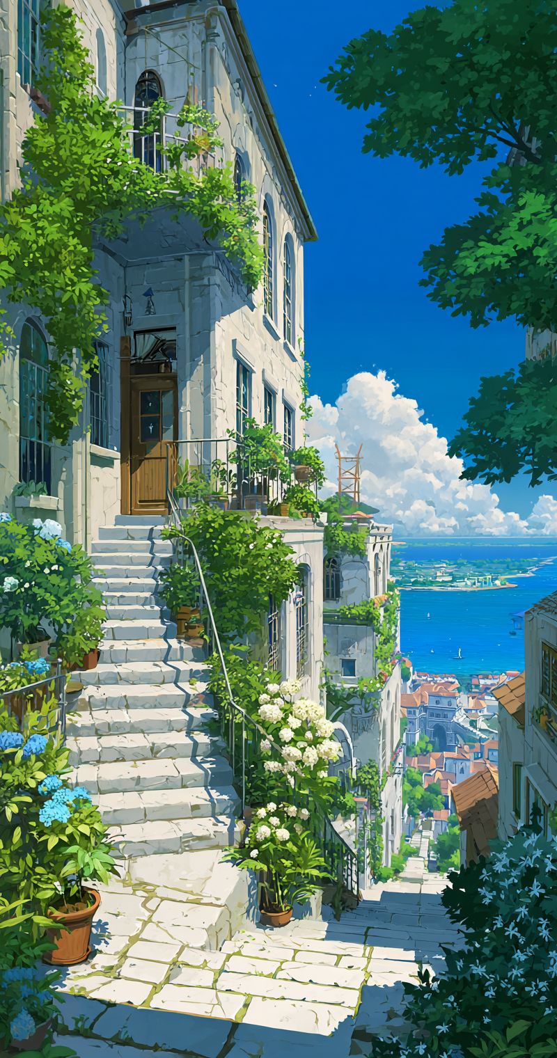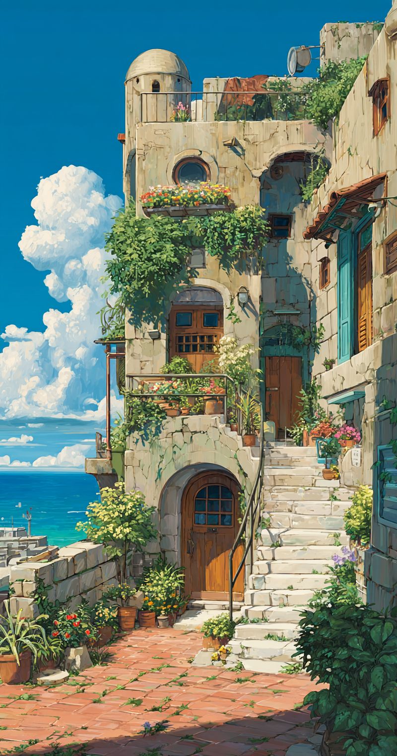 a beautiful old-style house in the city, with plants and flowers on its walls, white stone stairs leading to the entrance of the building, a blue sea in the far background, a sunny day, a bright sky, in the style of anime art, in the style of studio ghibli, in the style of greg rutkowski. --ar 67:128