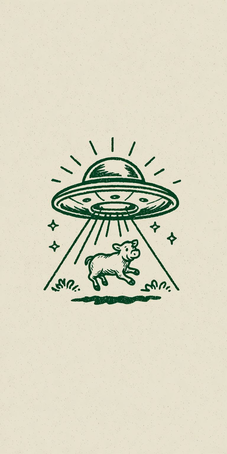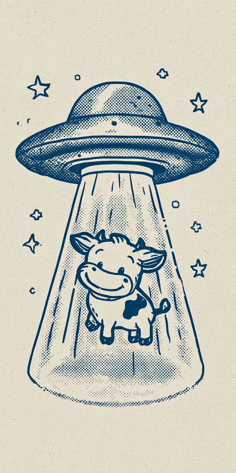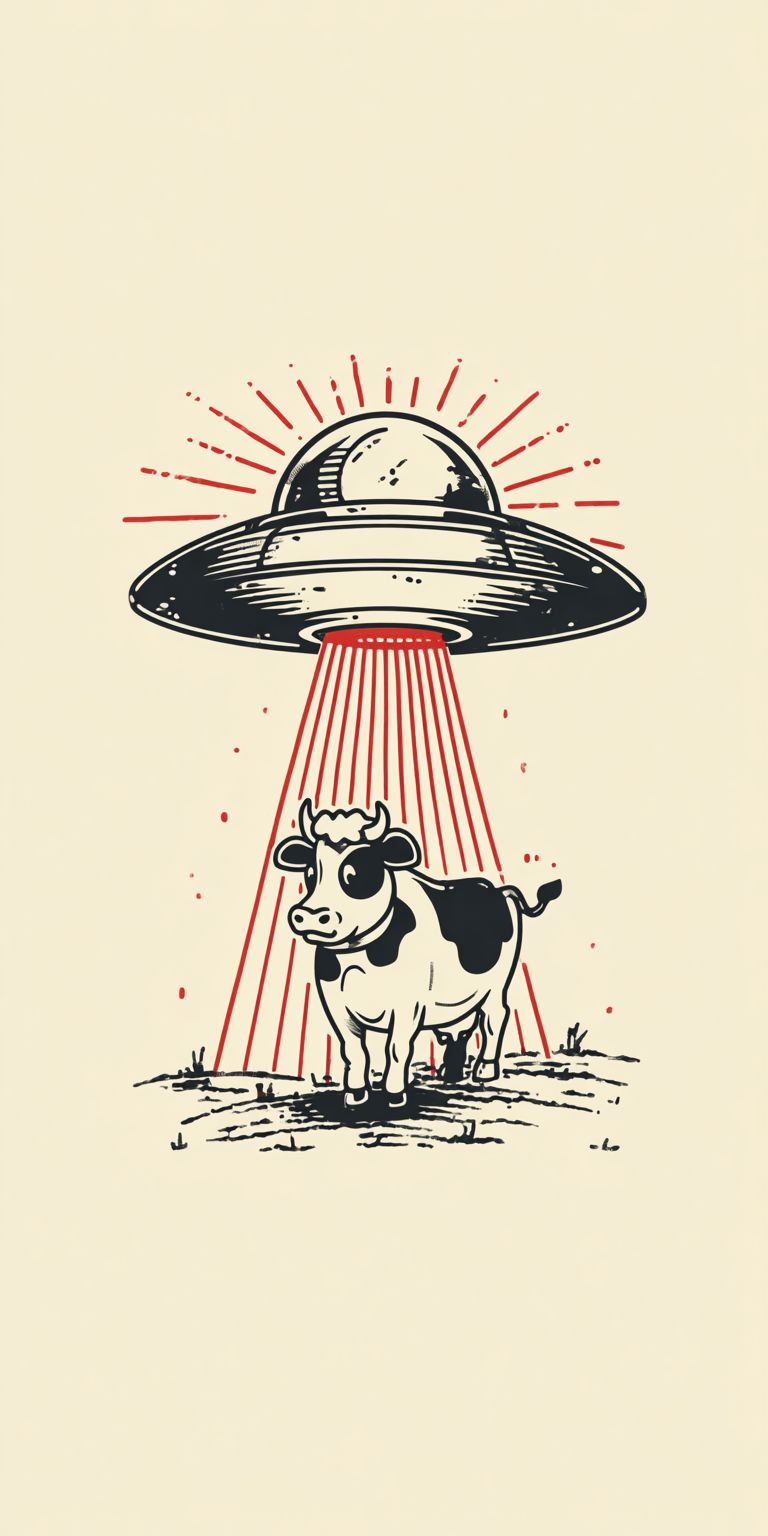 vintage cartoon of a 1950’s UFO lifting up a cow with its beam on the underside of the ufo, in screen print. Extremely simplified shapes, chibi-like proportions, thick outline, no detail beyond curve lines, one-color ink design. In the style of 1950s comic book covers. Perfect for retro T-shirt print. Off-white background --ar 1:2 --v 7.0