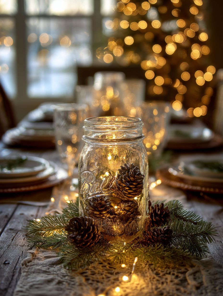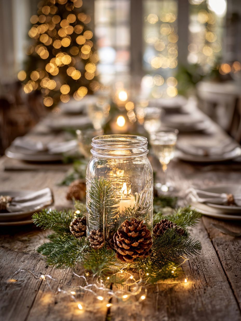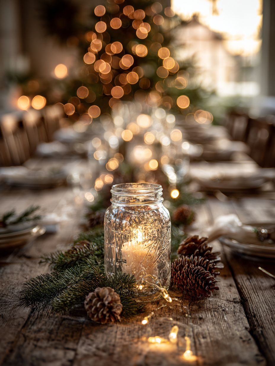 A long farmhouse dining table decorated with a glowing mason jar Christmas centerpiece. A large glass jar holds a lit candle surrounded by pinecones and evergreen sprigs, with delicate fairy lights running down the table. Soft golden morning light and warm bokeh from a Christmas tree in the distance create a cozy holiday atmosphere. Beautiful photography, ultra-detailed, natural lighting, shallow depth of field, crisp focus, high-resolution, cinematic composition --ar 3:4 --raw --v 7.0
