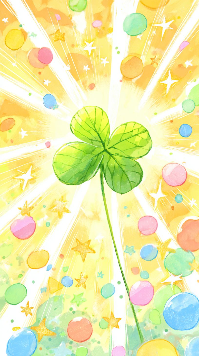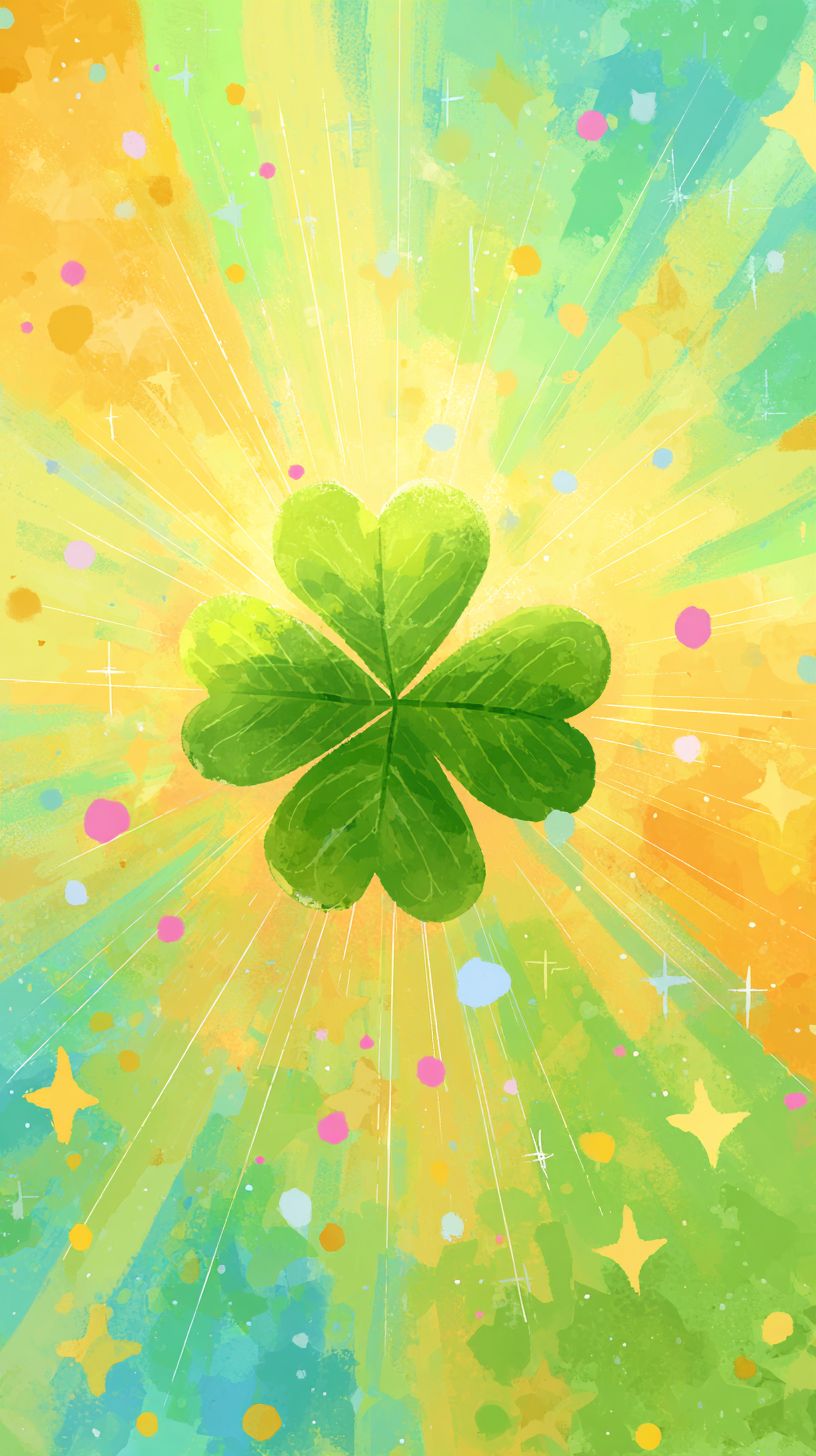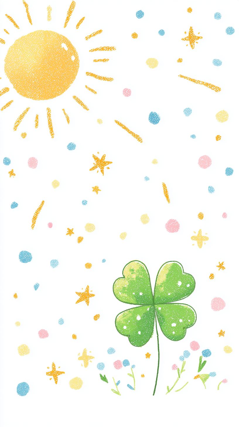 A cheerful children’s book illustration filled with bright lime-green and yellow hues. At the center, a cute little four-leaf clover glows like a tiny magical friend, surrounded by soft, hand-drawn sunbursts that stretch outward like warm sunshine. Sparkly stars twinkle around it, and colorful confetti dots--pink, blue, yellow--float gently in the air. The entire scene looks painted with crayons and soft pastels, playful and gentle, with a warm storybook charm. The atmosphere feels hopeful, lucky, and full of wonder, as if the clover is about to grant a wish, ultra hd, --ar 9:16 --v 7.0