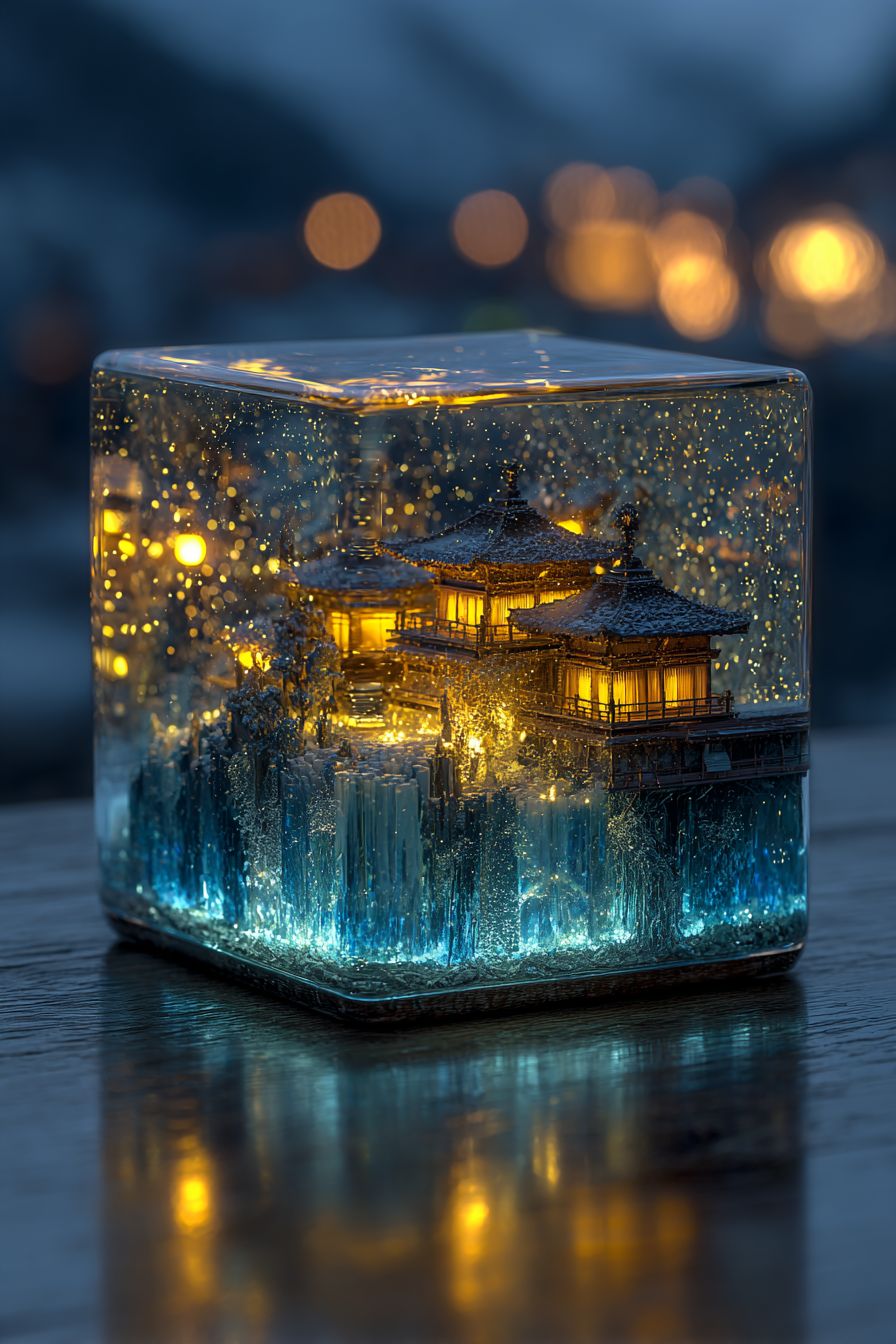Запечатанный стеклянный куб, содержащий два великолепно разделенных мира. Верхний мир: теплые светящиеся снежные древние японские храмы, мерцающие фонари, мягко падающий снег, плотная деревянная архитектура, теплая волшебная зимняя ночь, богатые детали. Нижний мир: сверкающий ледяной кристальный город, светящийся в глубоком синем, кристаллические столбы, поднимающиеся, как замороженные корни, биолюминесцентный свет, эфирный изморозь, тонкая светящаяся мембрана разделяет два слоя. Края стеклянного куба преломляют свет, как драгоценный камень, тонкое радуги, крошечные плавающие снежные частицы, подвешенные внутри куба, размещены на отражающем деревянном столе, фон мягко размытый деревенский боке с горами, мечтательное волшебное настроение, гиперреалистическая текстура, ультра детализированное освещение, прекрасная цветовая гармония (теплый золото вверху, холодный синий внизу), эстетика предмета искусства премиум-класса, высоко collectible.